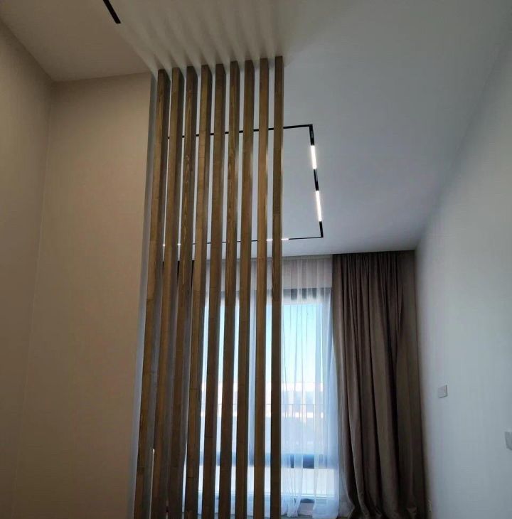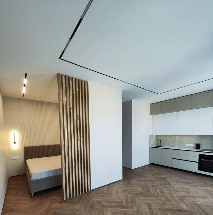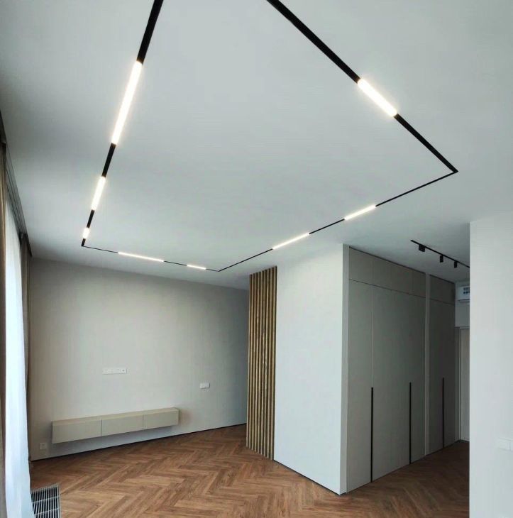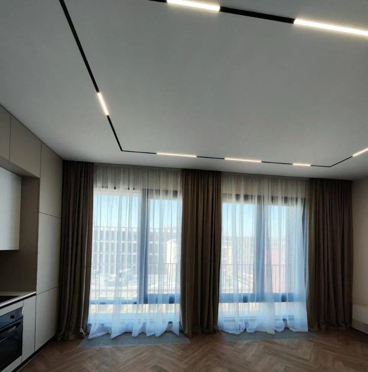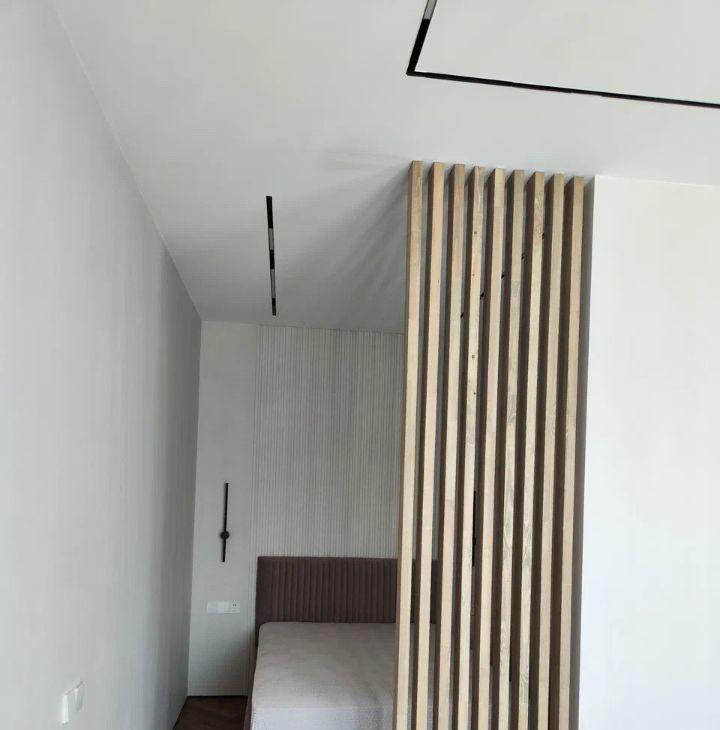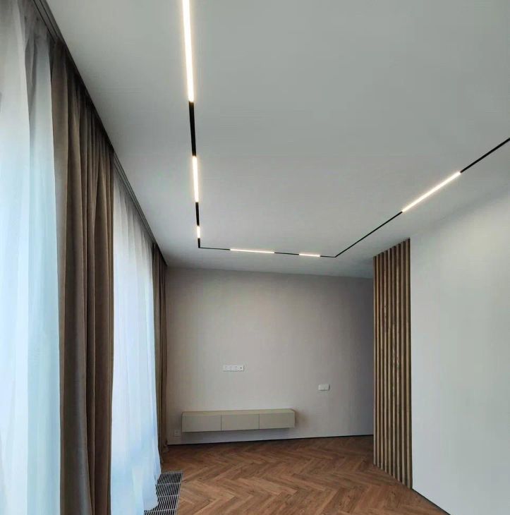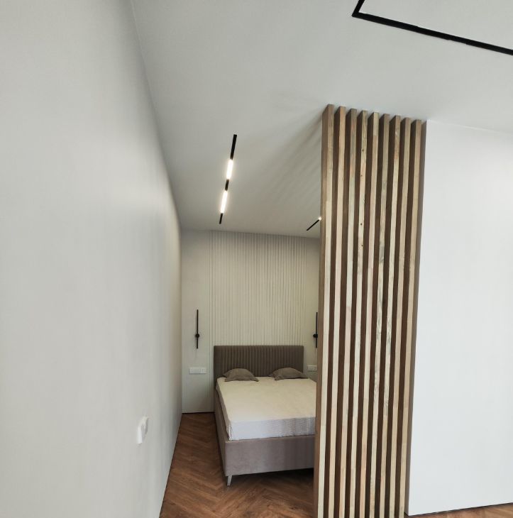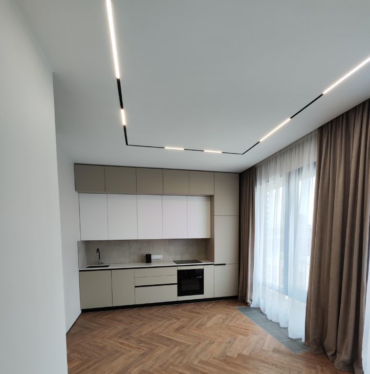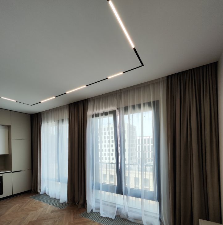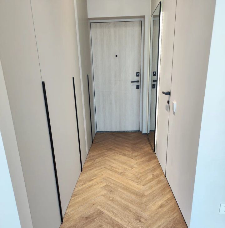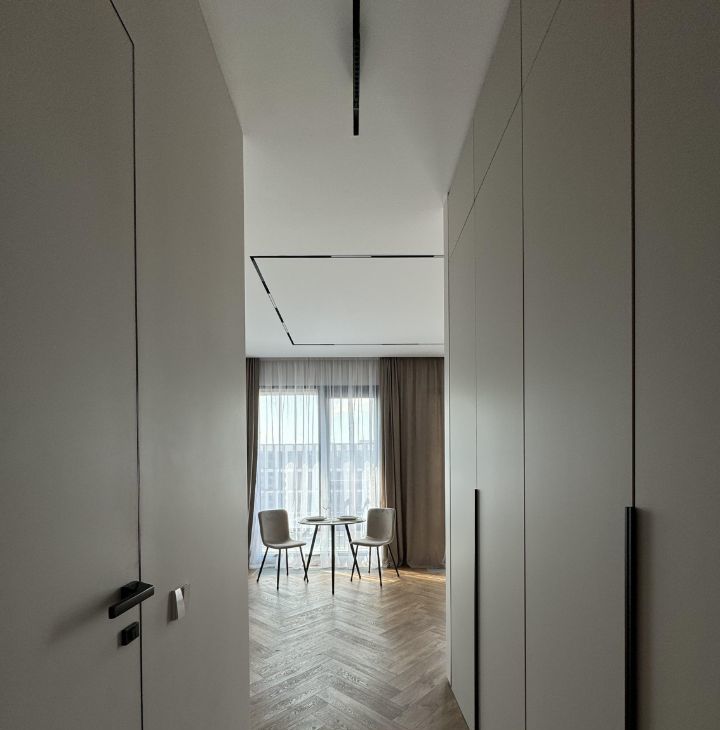 В квартире установлена система умного дома: голосовое управление освещением через умную колонку Алиса от Яндекс. На полу выложен кварцвинил, вместо плинтуса установлен интерьерный теневой профиль. Потолок сделан из гипсокартона, во всей квартире стоит трековая система освещения.