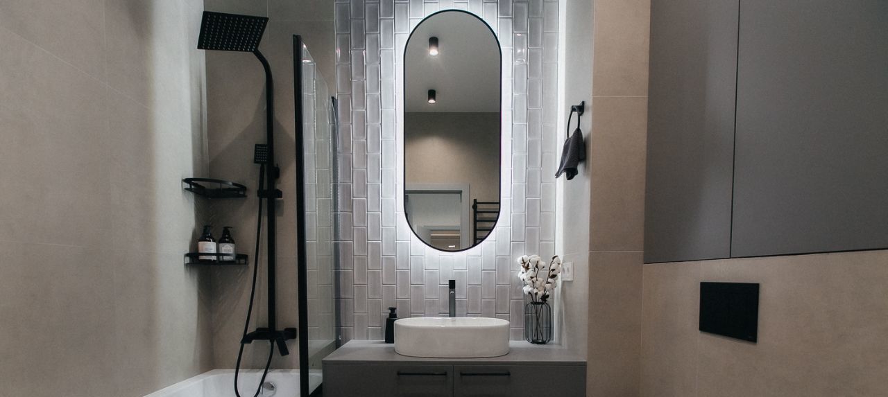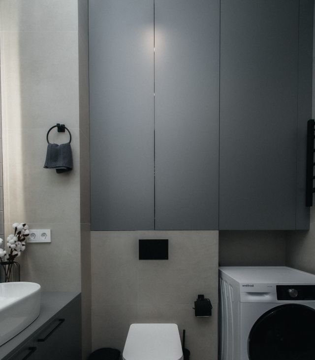 4. Совмещенный санузел: ванна с душем, бойлер, стиральная машина Vestfrost, полки для хранения, датчики протечки Neptun, сенсорное зеркало, итальянские и немецкие смесители