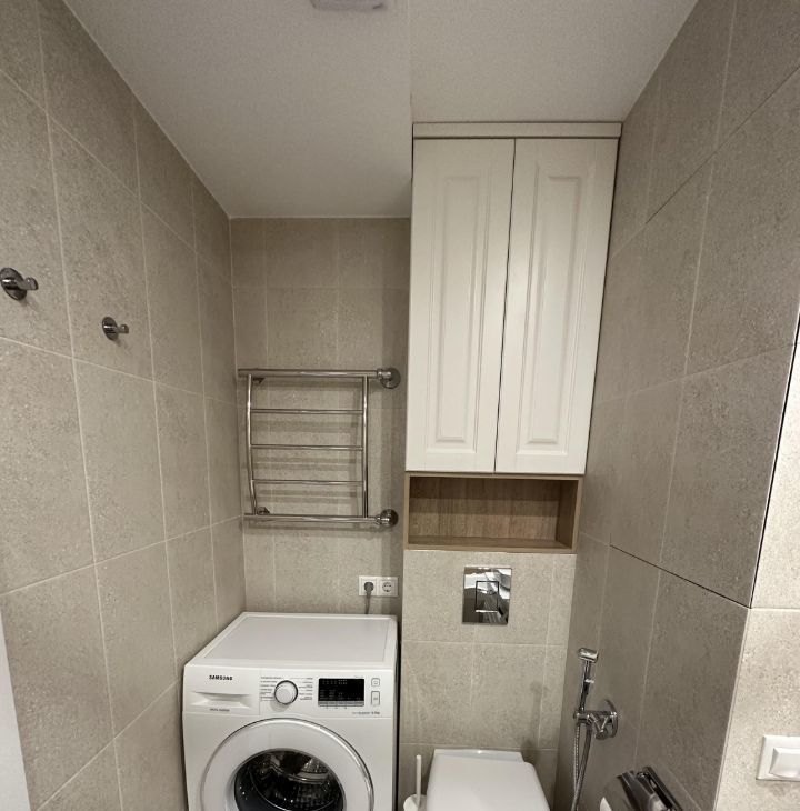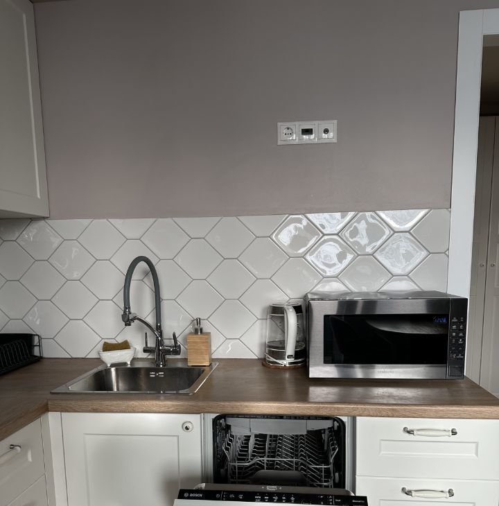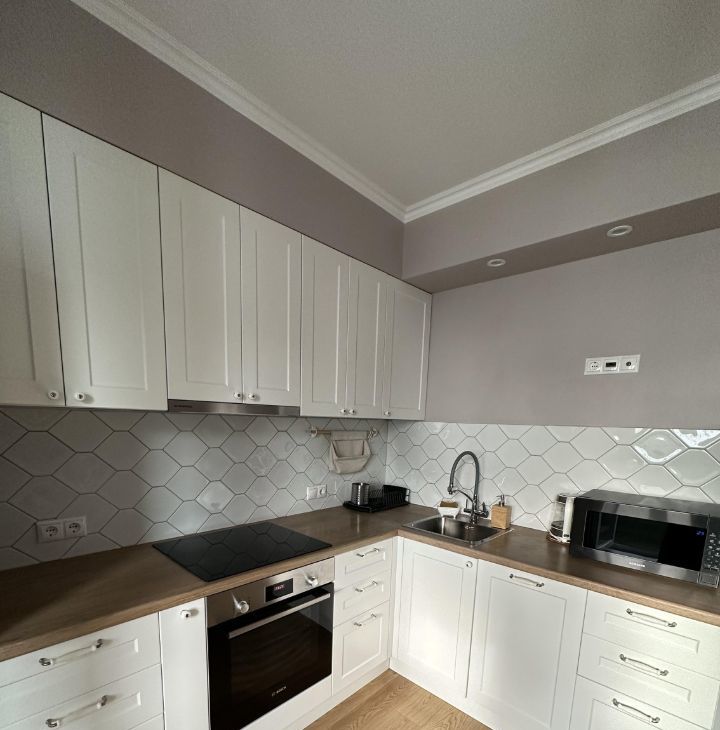 Однокомнатная квартира рядом со школой и лесом. Кухня со всей необходимой техникой. Много мест для хранения,в том числе гардеробная