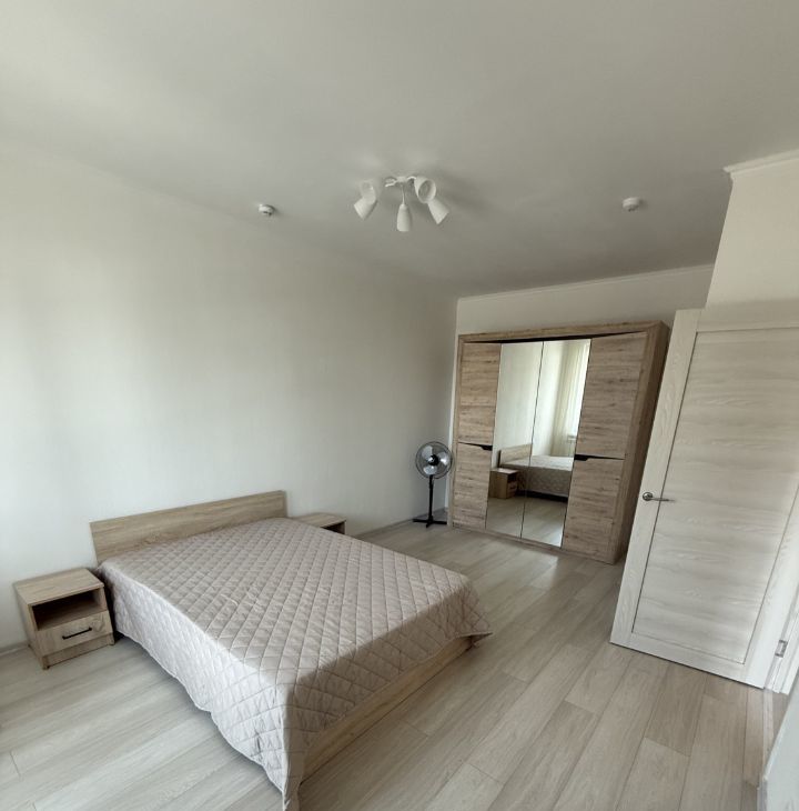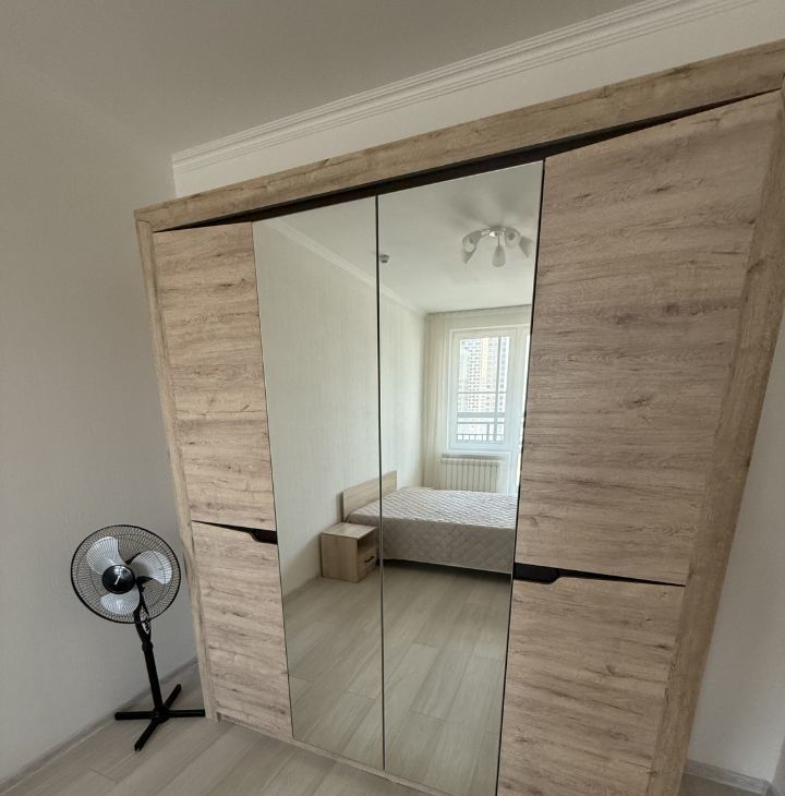 В комнате стоит новый шкаф, новая двуспальная кровать с новым ортопедическим матрасом, высотой 22 см, гладильная доска.