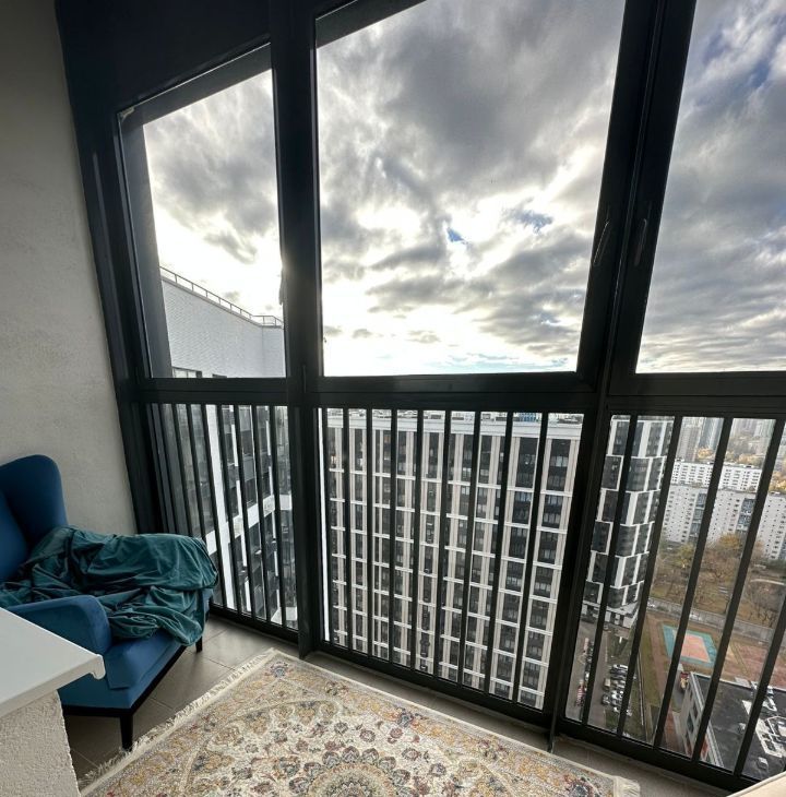 Квартира с гардеробной комнатой, большой кухней , просторной комнатой с панорамным балконом . Есть кондиционер.