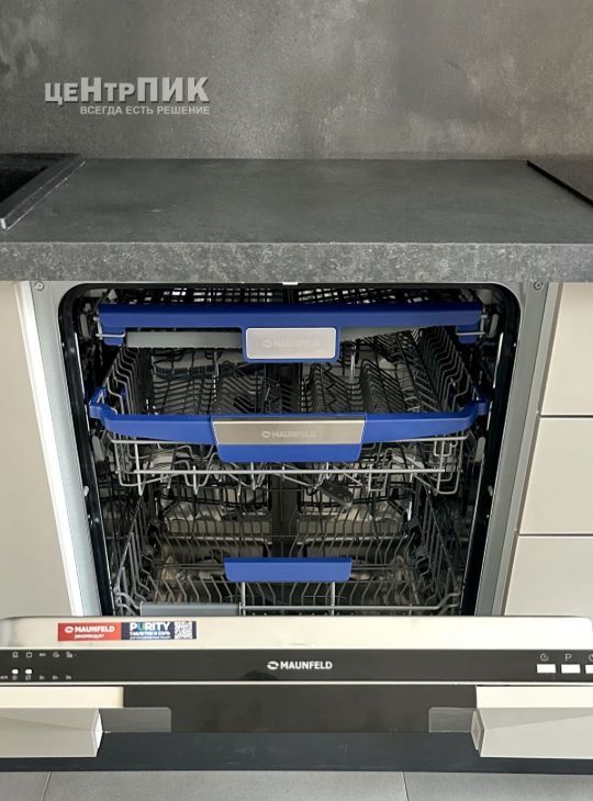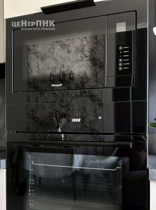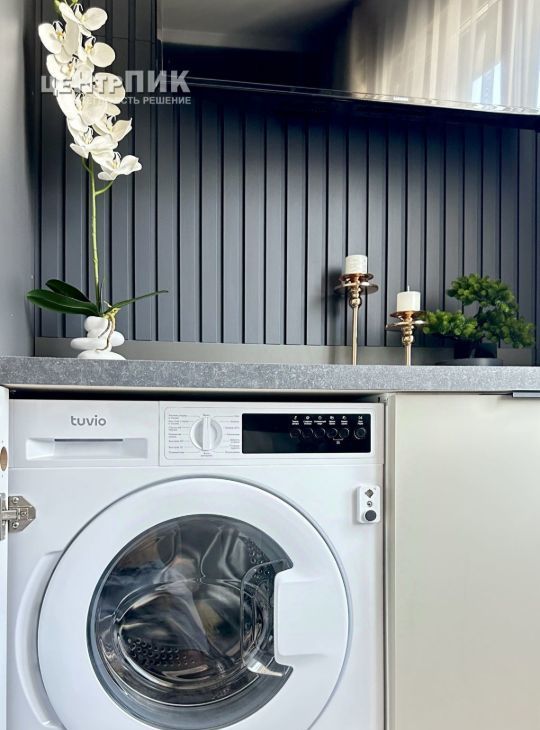 + Кухня со встроенной техникой: варочной панелью, вытяжкой, духовым шкафом, микроволновой печью, посудомойкой 60 см, холодильником и стиральной машиной с сушкой.