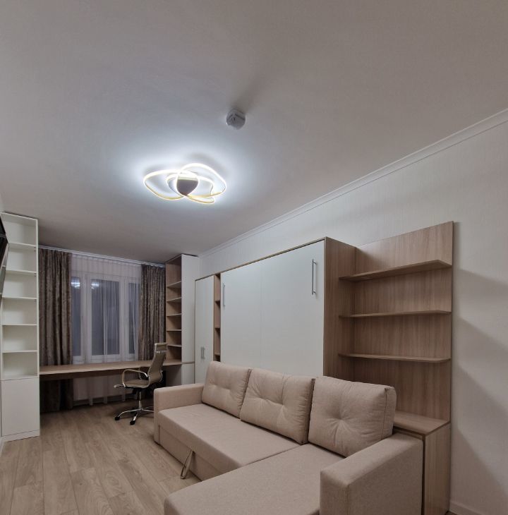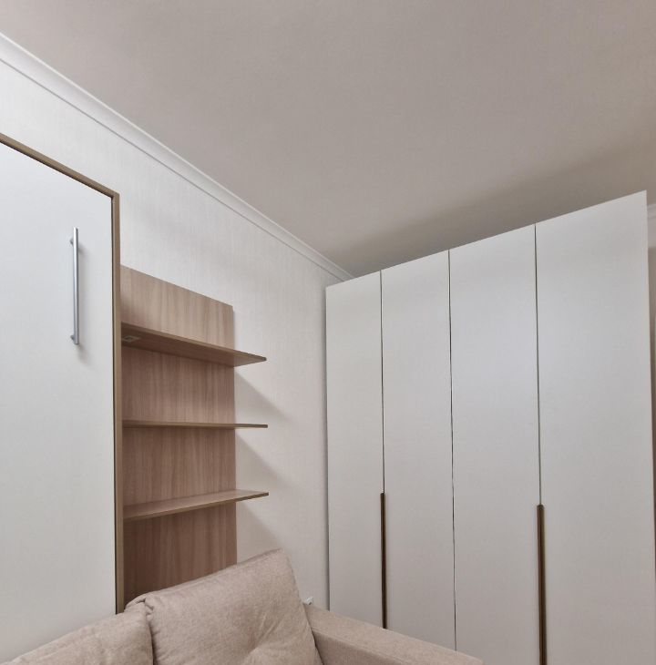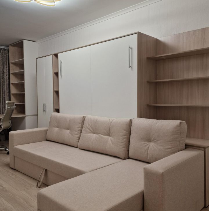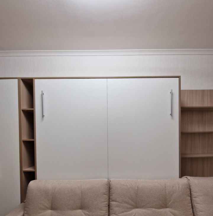 Мебель в комнате трансформируется, вместо дивана опускается двуспальная кровать с ортопедическим матрасом!
