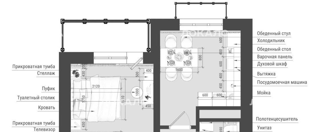Техника: холодильник, стиральная машина, плита, вытяжка, духовой шкаф, посудомоечная машина, утюг, инверторный кондиционер.