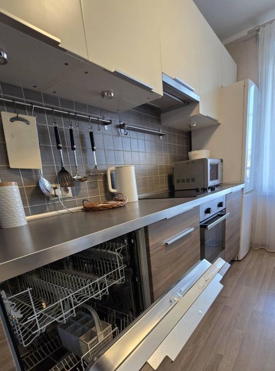 Вся техника и необходимая мебель, холодильник bosch, посудомойка, стиральная машина и пр.