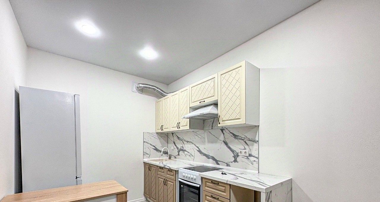 Квартира оснащена вместительным кухонным гарнитуром, мебелью и бытовой техникой: