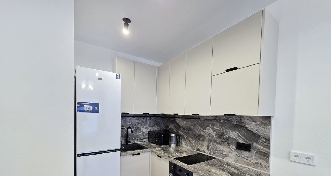 Бытовая техника: стиральная машина, холодильник, варочная панель, духовой шкаф, микроволновая печь, электрический чайник.