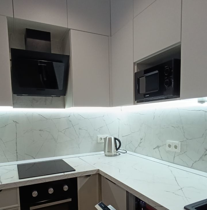 Имеется вся необходимая бытовая техника: встроенный холодильник, плита, духовой шкаф+свч, посудомоечная машина, вытяжка, чайник.