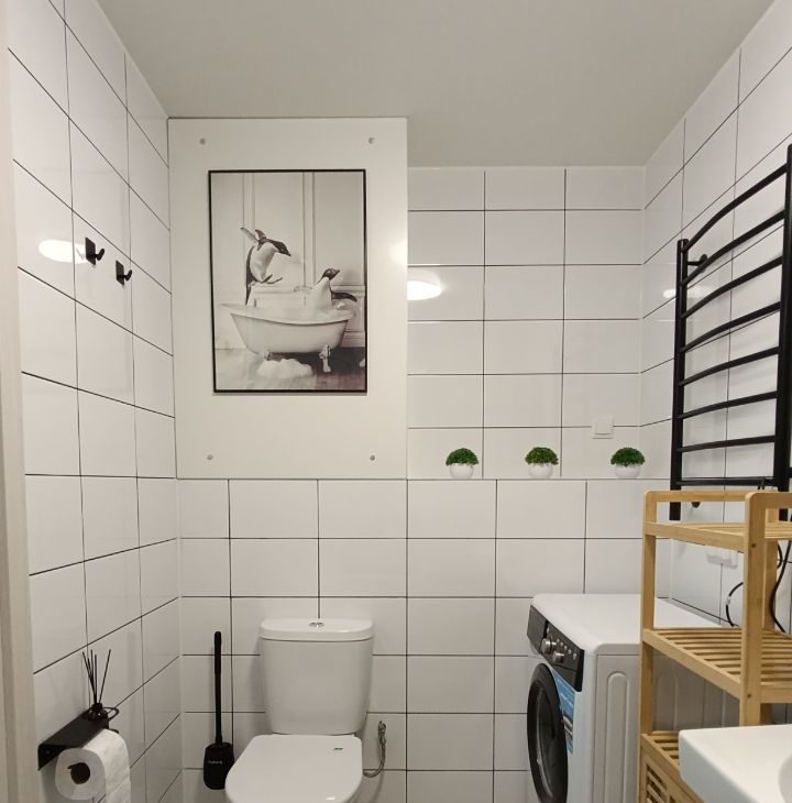 Ванна оборудована стиральной машиной и электрическим полотенцесушителем.