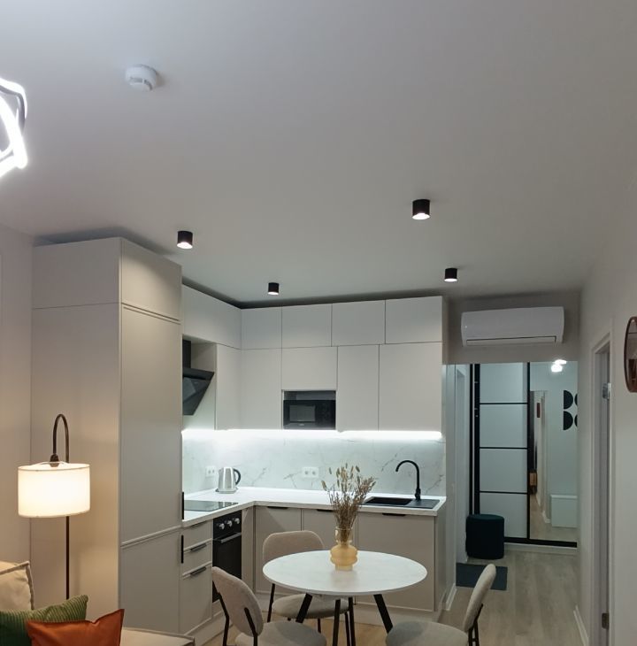 (телевизор,кoндиционep, поcудoмоечная мaшинa, дуxовка+микpoвoлнoвка, вытяжка, плита, встроенный холодильник, стиральная машина, полотенцесушитель, чайник,пылесос).