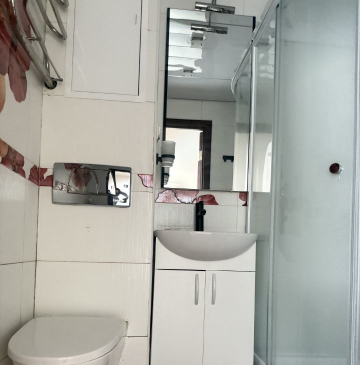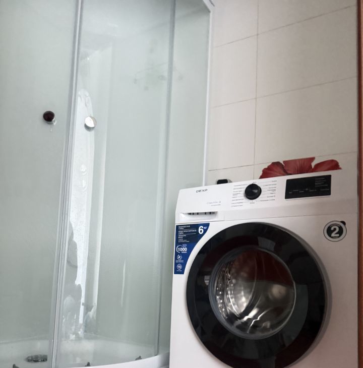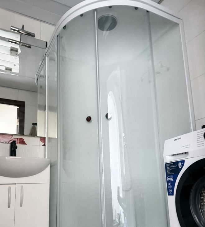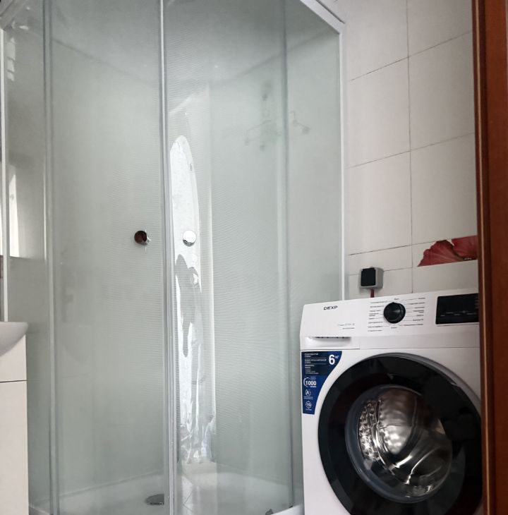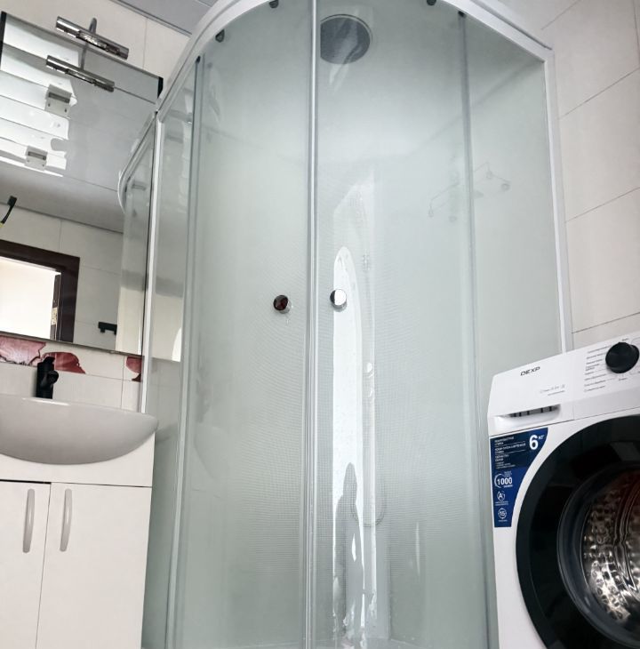 Ванная: новая душевая кабина, новая стиральная машина, новая современная сантехника