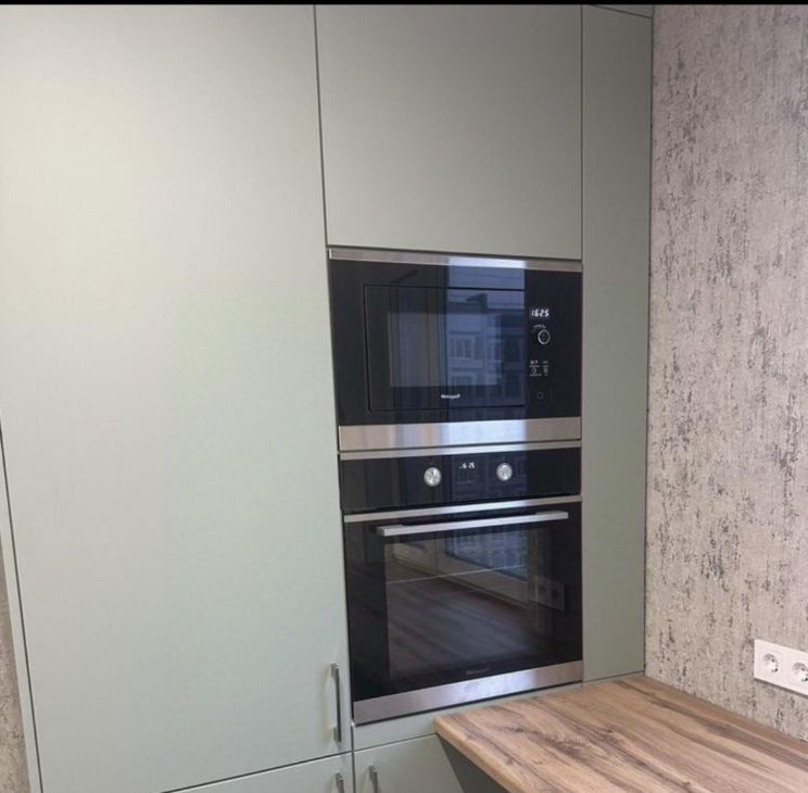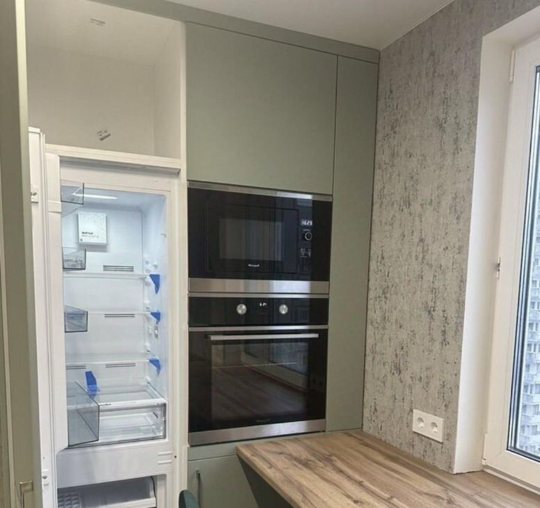 На кухне вся встраиваемая техника: холодильник, духовой шкаф, варочная, микроволновая печь, посудомоечная машина.