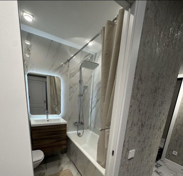 Сан узел: плитка kerama marazzi, чугунная ванная, инсталляция, гигиен. душ, стиральная машинка, электрический полотенцесушитель, водонагреватель.