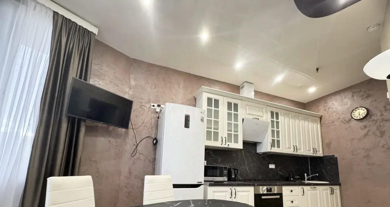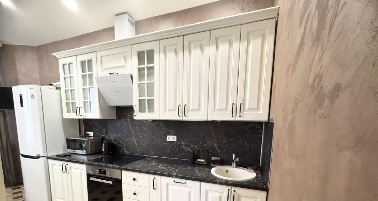 холодильник с морозильной камерой, духовой шкаф, микроволновая печь, вытяжка, индукционная варочная поверхность, чайник.