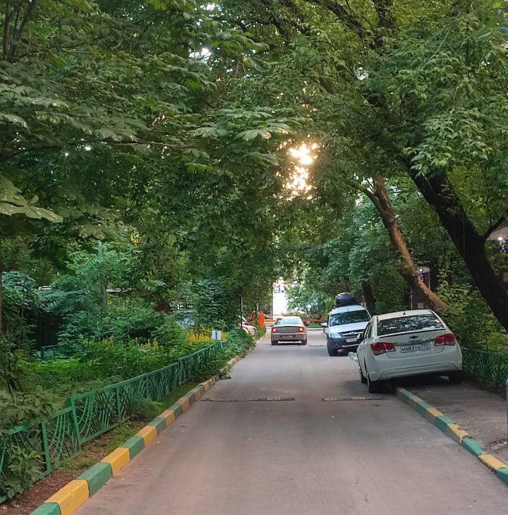 Тихий, утопающий в зелени двор, огороженная территория.