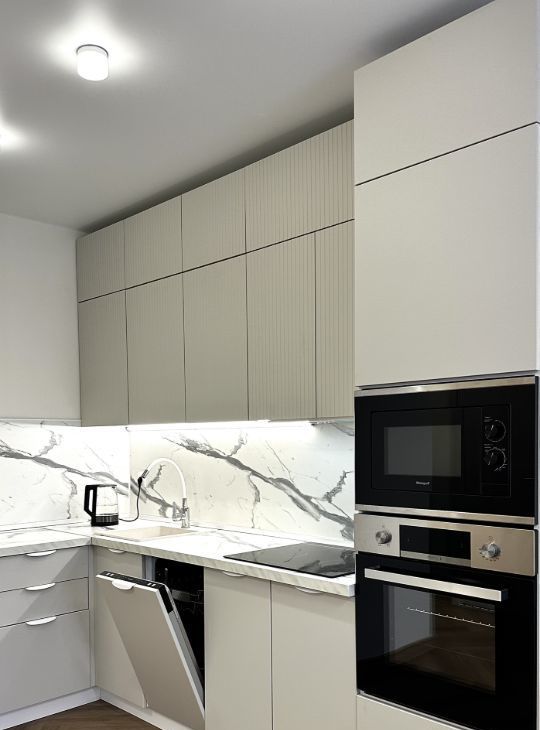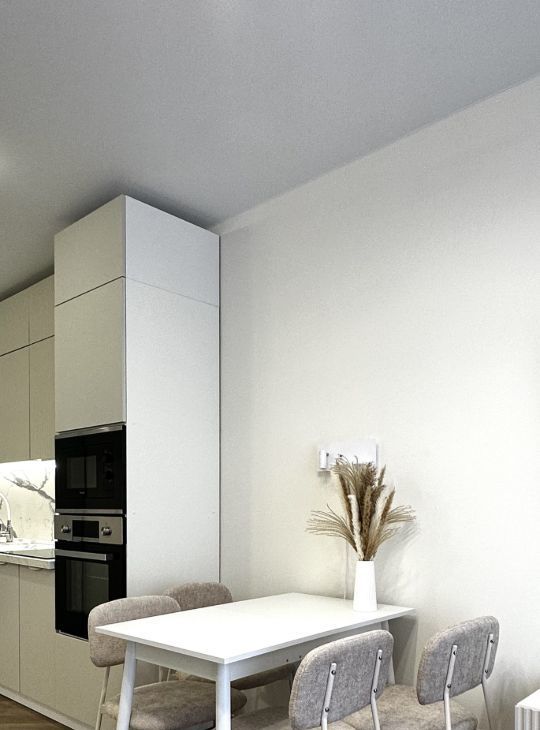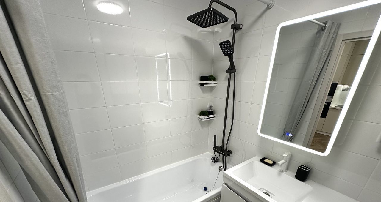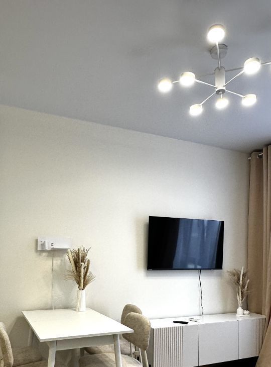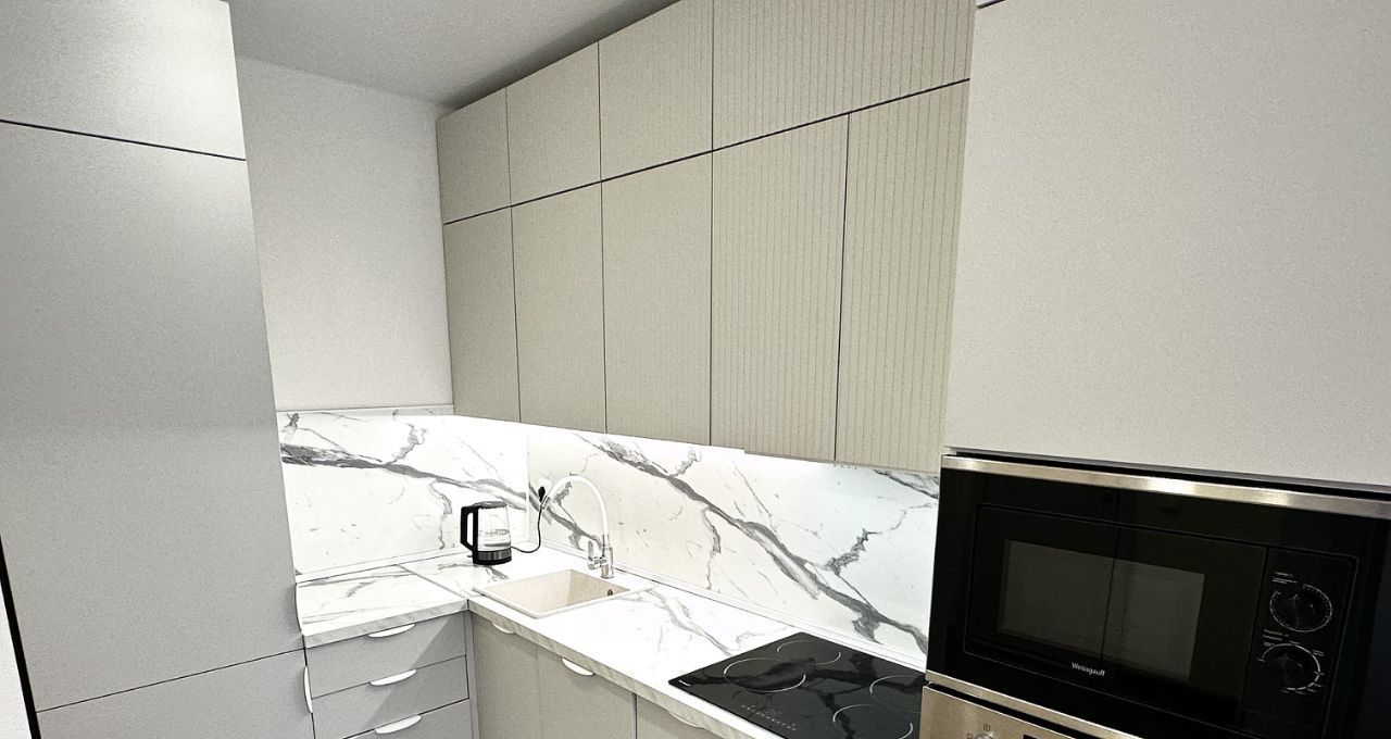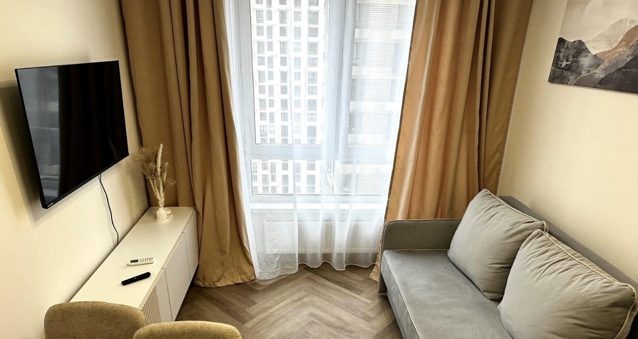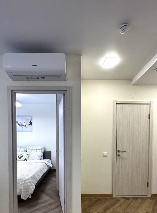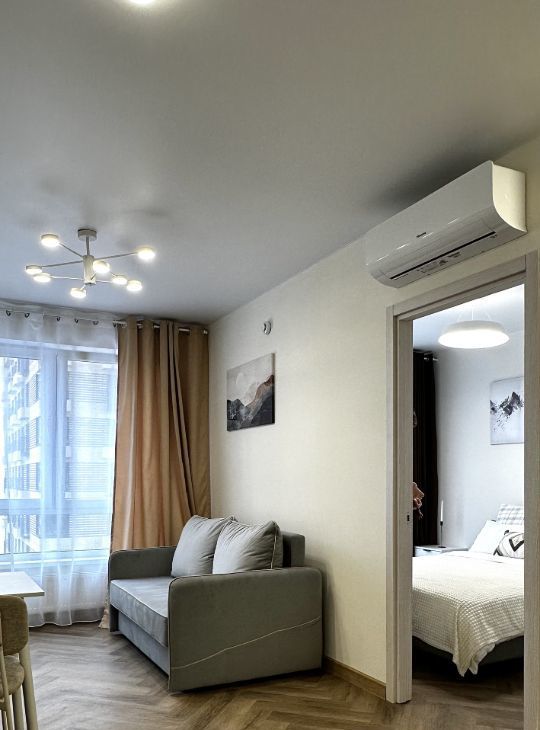 В квартире сделан евроремонт, что придаёт ей стильный и современный вид. Она полностью меблирована, поэтому вам не нужно беспокоиться о покупке мебели. На кухне и в комнате есть всё необходимое для комфортного проживания. Из техники в квартире установлены кондиционер, холодильник, посудомоечная машина, телевизор и стиральная машина. Санузел совмещённый, с ванной, что создаёт дополнительное удобство.