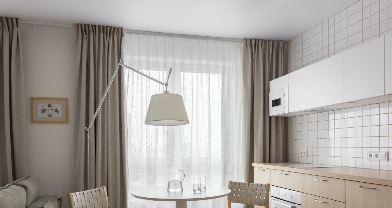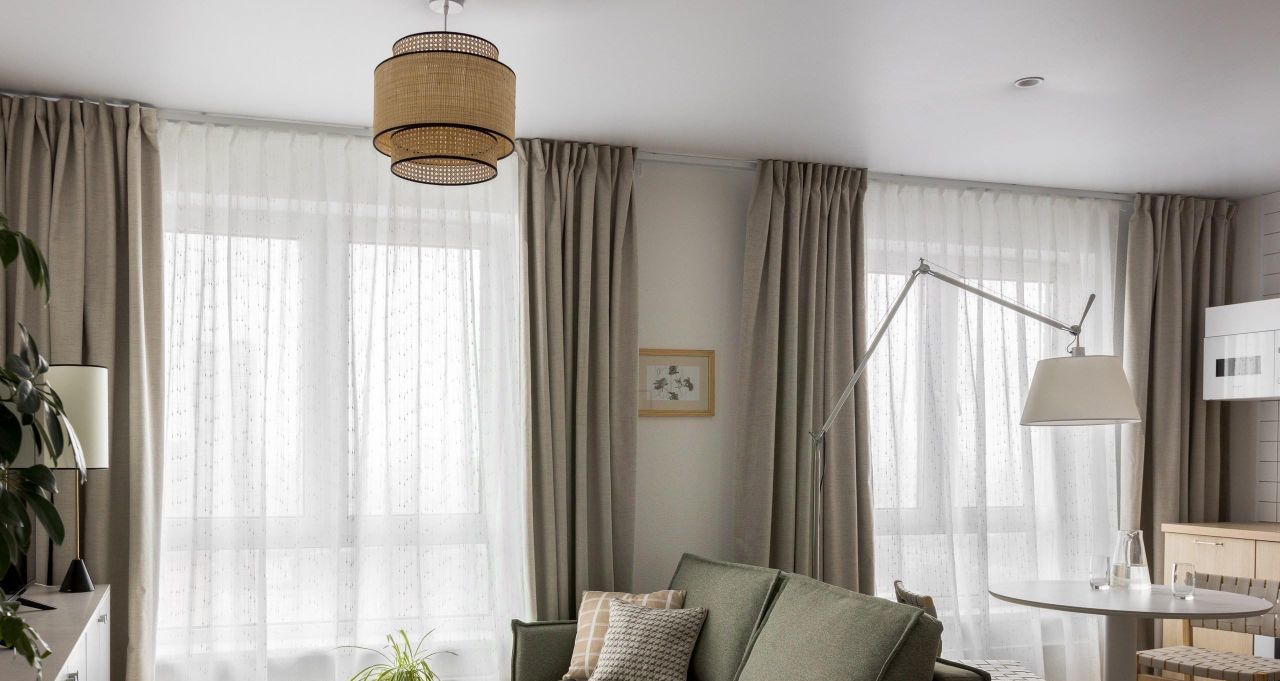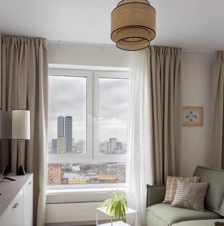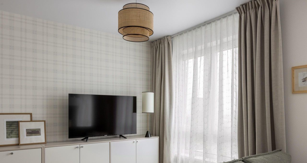 В зоне гостиной комфортный раскладной диван. А шторы блэкаут обеспечат вам качественный сон.