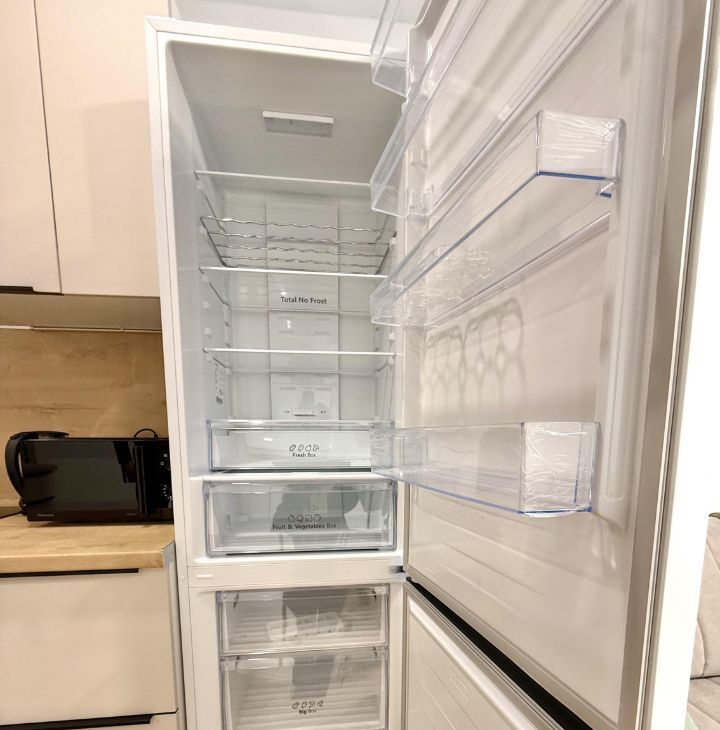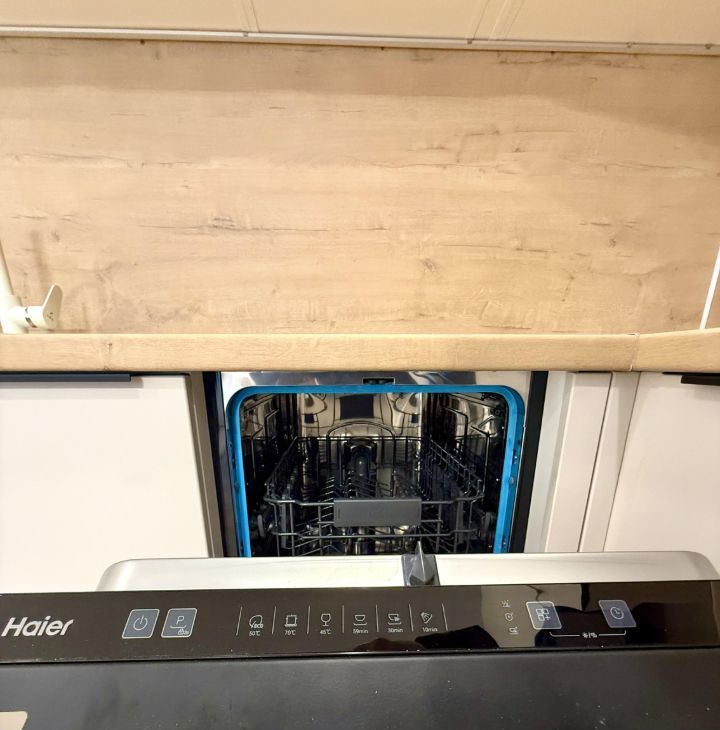 Кухня оборудована всем необходимым: фильтром для воды, посудомоечной машиной, варочной панелью, духовым шкафом, холодильником, вытяжкой, посудой и приборами.