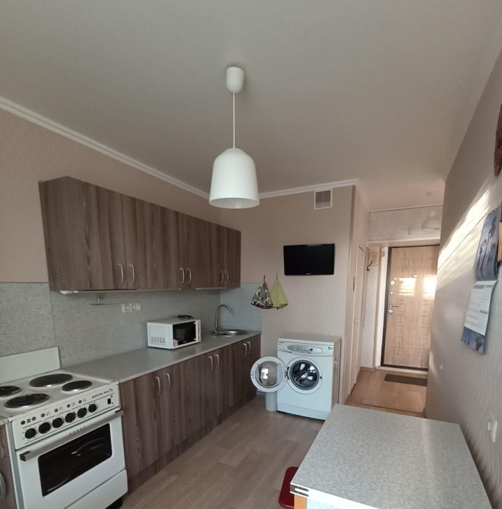 В квартире сделан косметический ремонт, что создает приятную атмосферу для проживания. Просторная кухня площадью 10.5 кв. м полностью оборудована мебелью и техникой: холодильником и стиральной машиной. В комнате также есть вся необходимая мебель и телевизор. Совмещенный санузел с ванной, окна выходят во двор, что обеспечивает тишину и спокойствие.