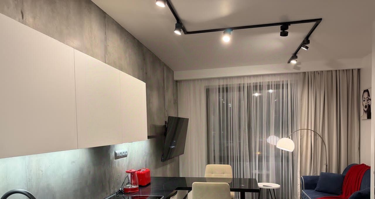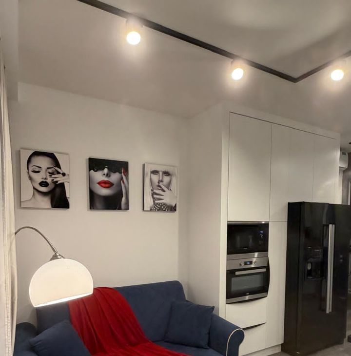 • В гостиной: стол с барными стульями, раскладной диван (гостевое спальное место), журнальный столик.