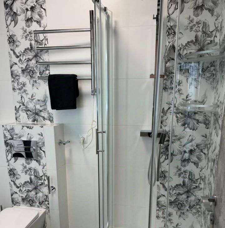 • Ванная: акриловый поддон со стеклянными дверцами, сантехника Roca и Kerama Marazzi, электрический полотенцесушитель.