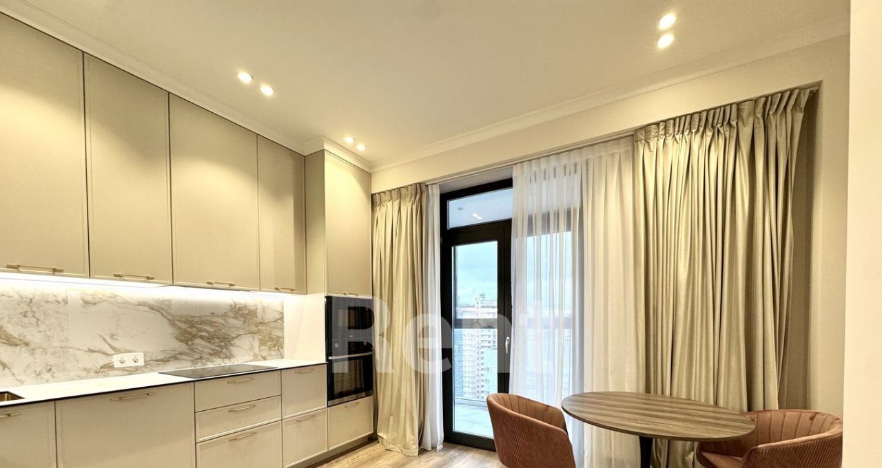 Для комфортного проживания в наличии вся необходимая мебель. Кухонный гарнитур оснащён посудомоечной машиной и духовой печью, установлен кондиционер. Для хранения предусмотрены две гардеробные комнаты. Есть лоджия — дополнительное пространство для отдыха или работы.