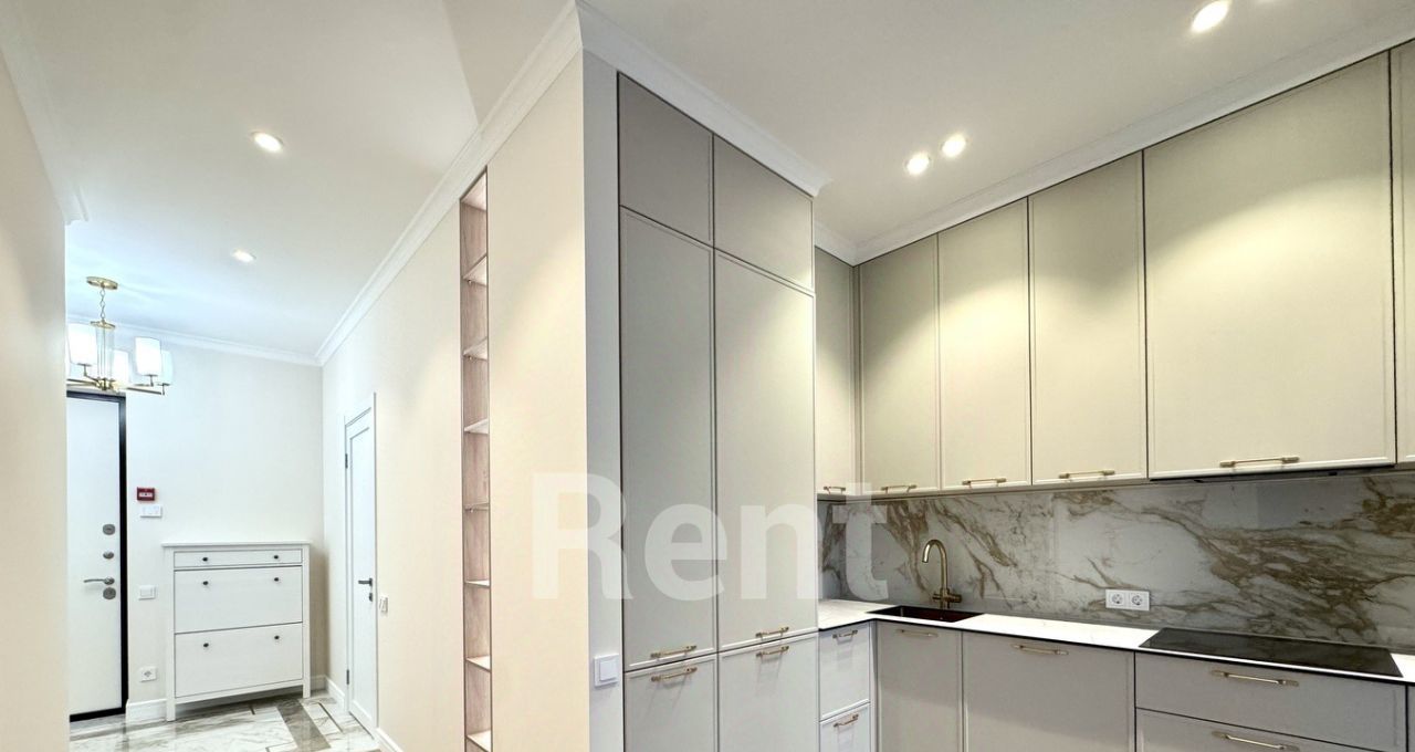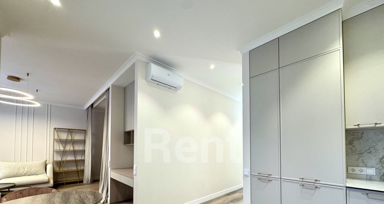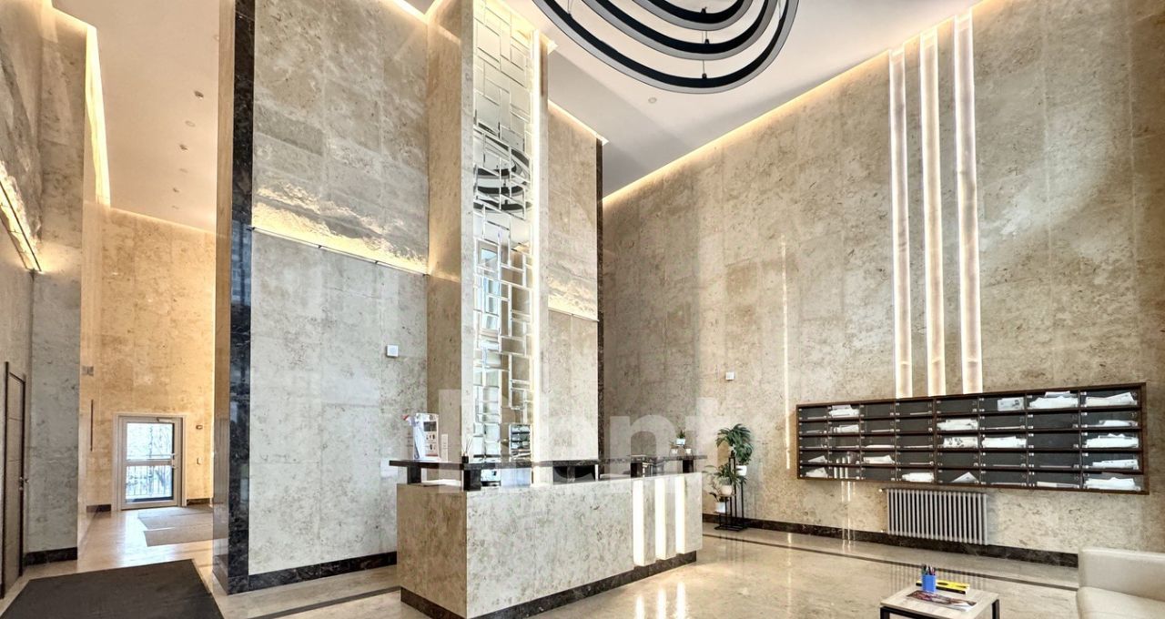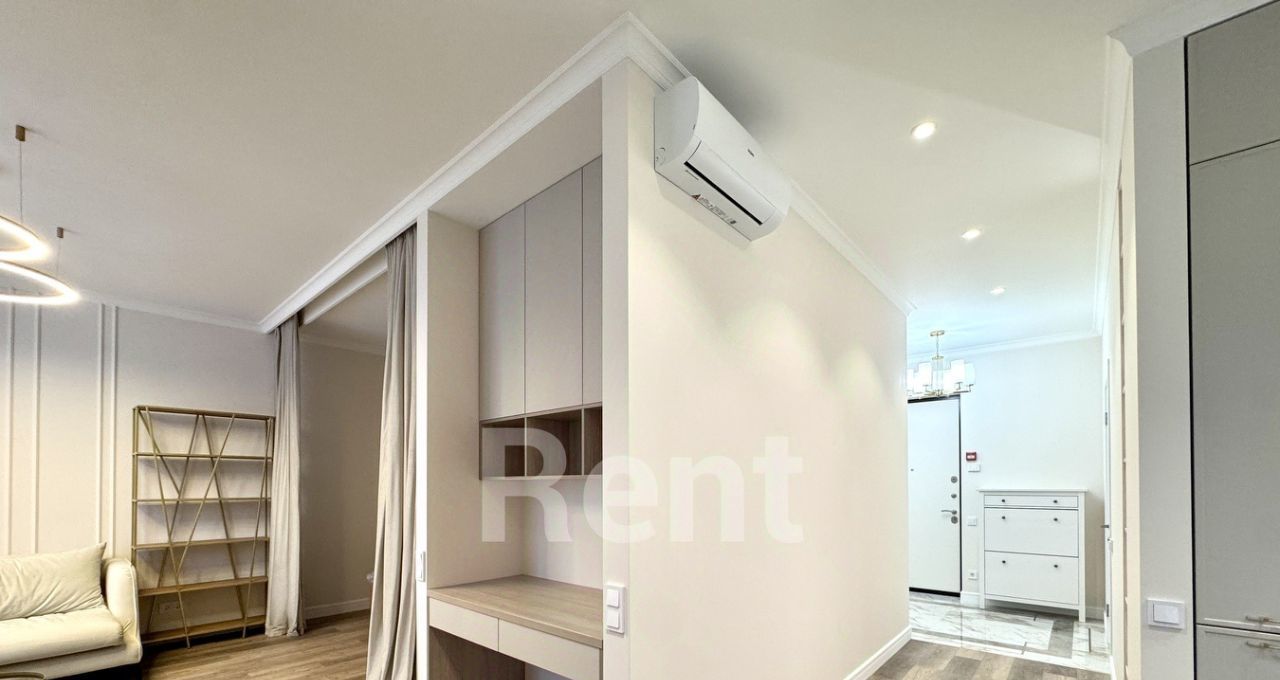 Для комфортного проживания в наличии вся необходимая мебель. Кухонный гарнитур оснащён посудомоечной машиной и духовой печью, установлен кондиционер. Для хранения предусмотрены две гардеробные комнаты. Есть лоджия — дополнительное пространство для отдыха или работы.