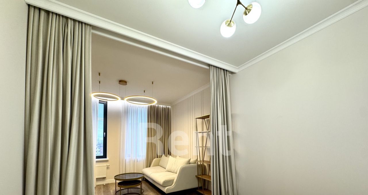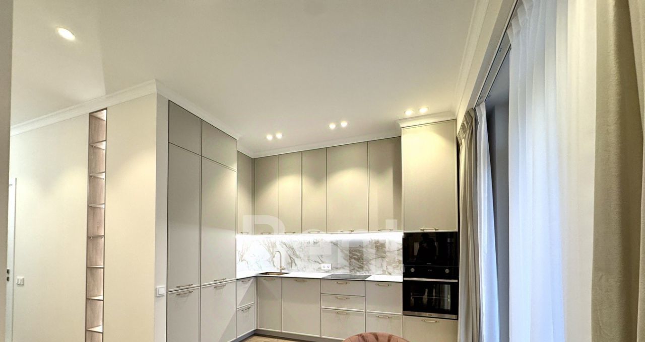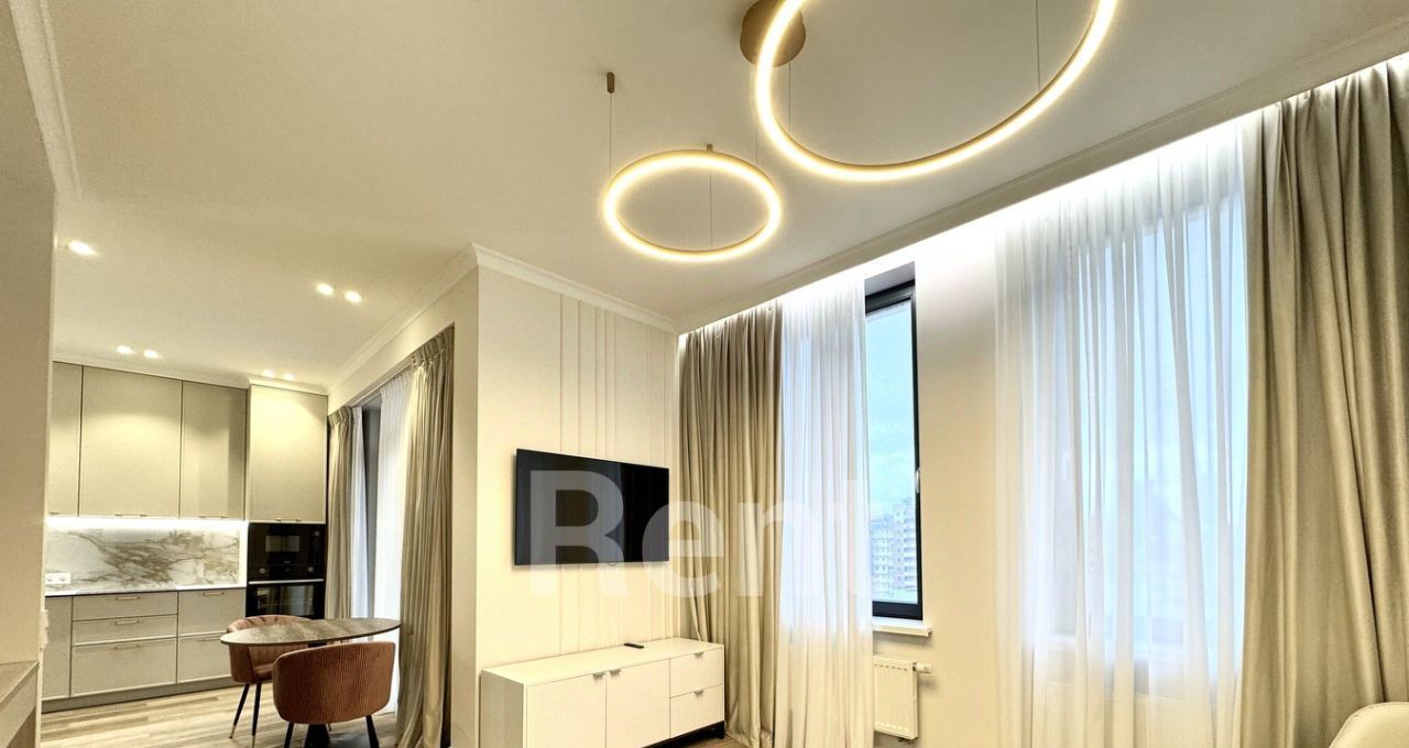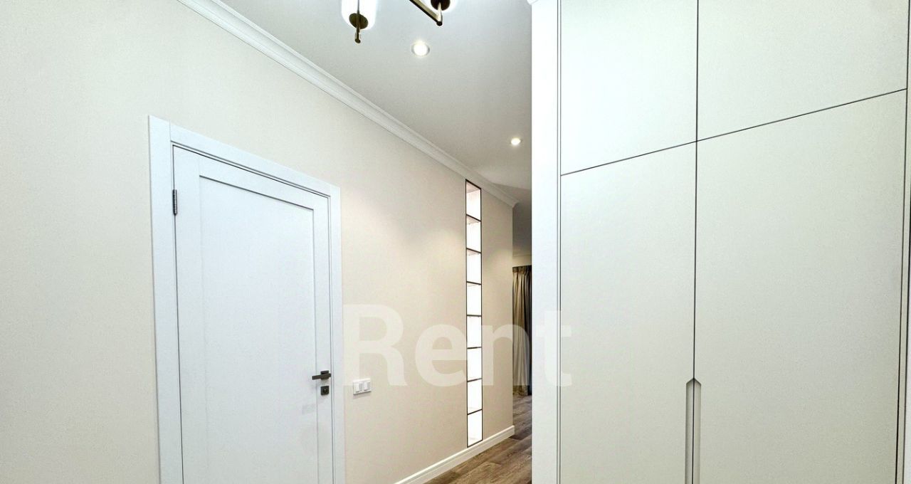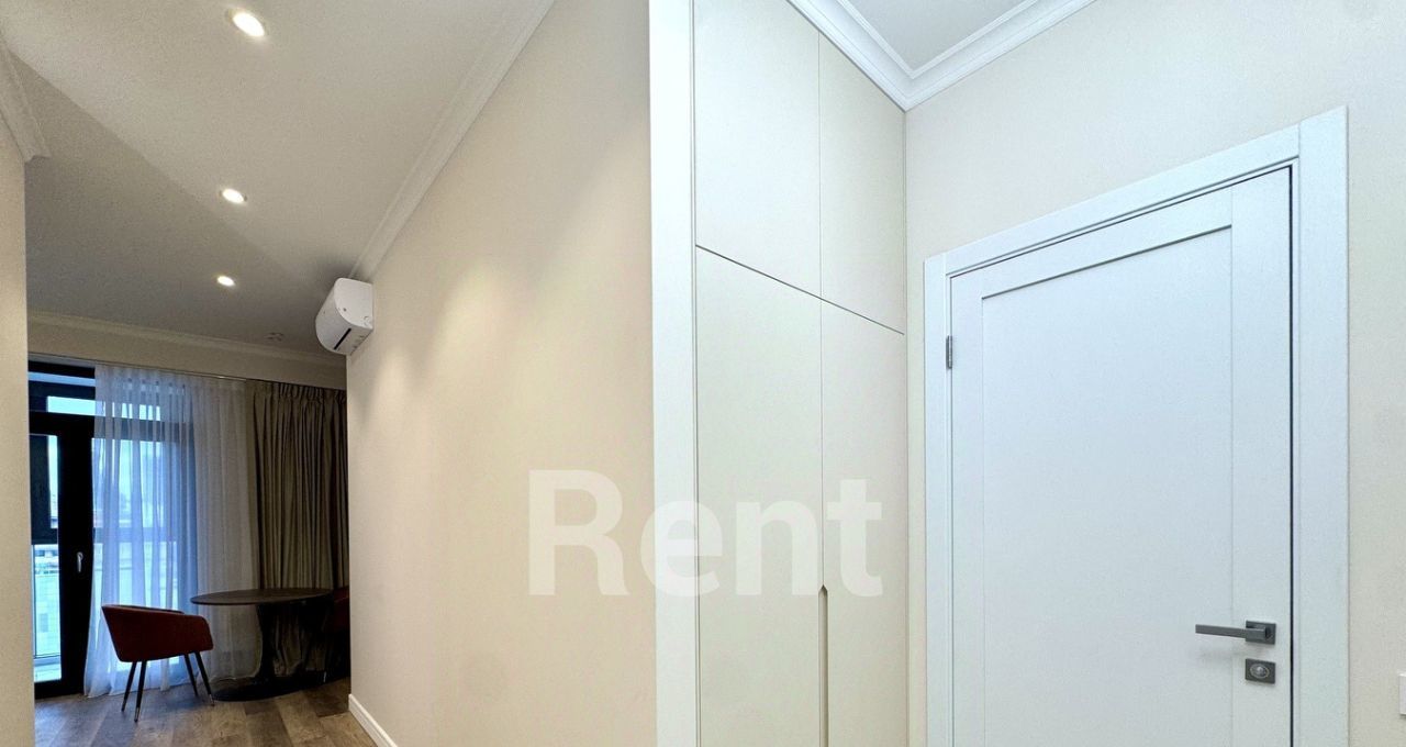 Для комфортного проживания в наличии вся необходимая мебель. Кухонный гарнитур оснащён посудомоечной машиной и духовой печью, установлен кондиционер. Для хранения предусмотрены две гардеробные комнаты. Есть лоджия — дополнительное пространство для отдыха или работы.