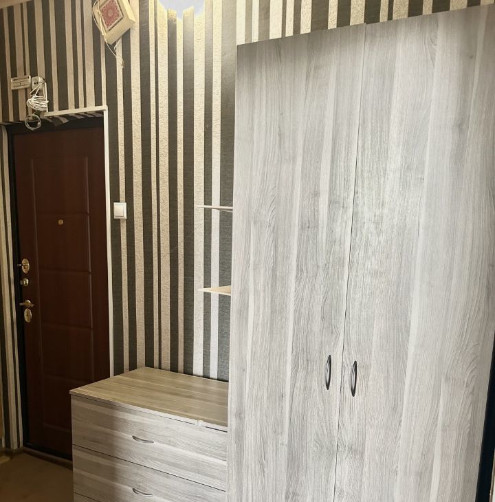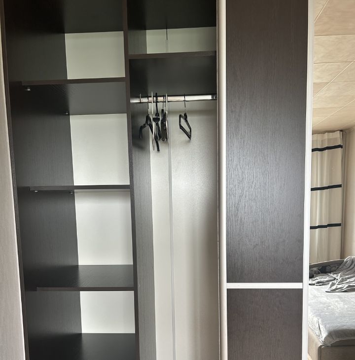 Спальное место- тахта с ящиком для хранения. Просторный шкаф с зеркальными дверьми. Комод и шкаф в прихожей.