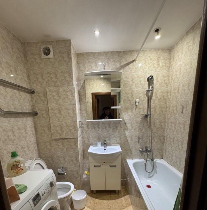 • Ванная комната с ванной иунитазом, отделана плиткой, установлена стиральная машина,