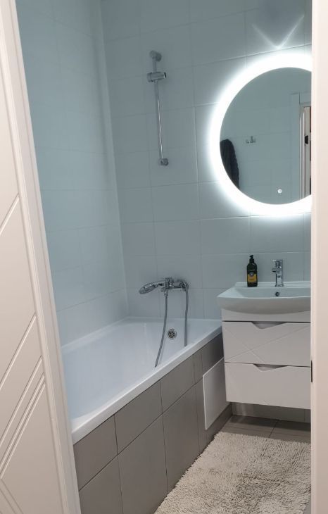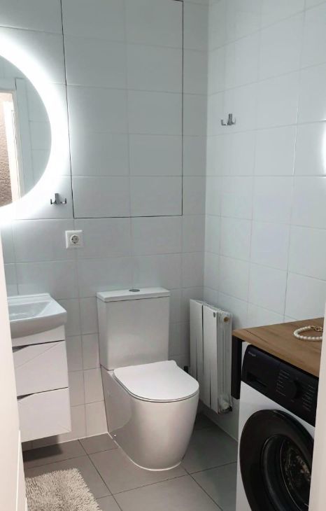 Ванная комната 4 кв. м , ванна длиной 170 см , стиральная машинка с инвертор двигателем , с функцией пар ( 15 режимов стирки )