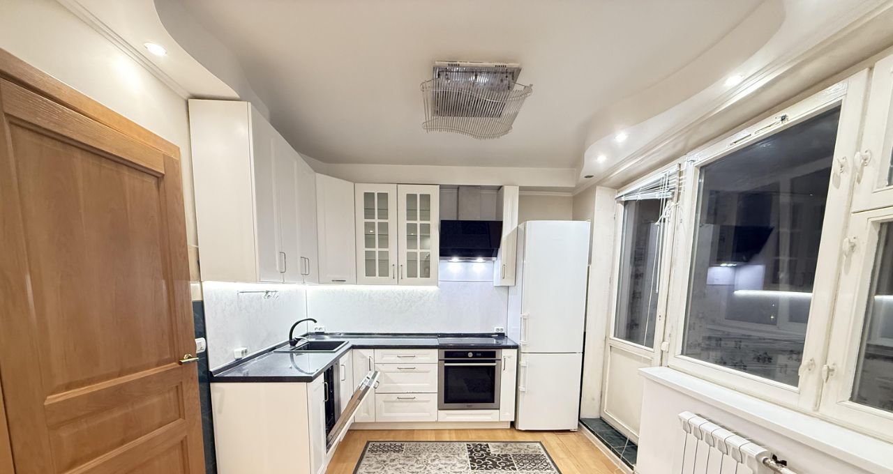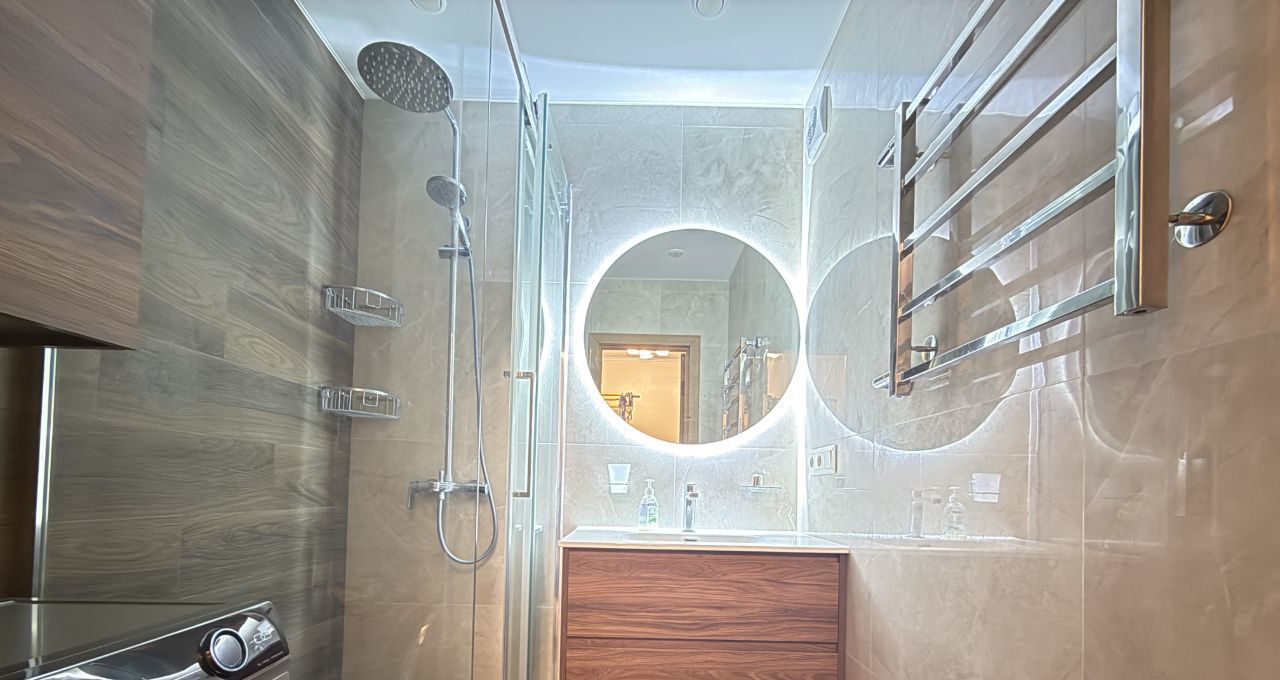 Квартира с евроремонтом, в комнатах и на кухне есть вся необходимая мебель. Кухня оборудована современной техникой: холодильником, посудомоечной машиной. В ванной комнате установлена душевая кабина.