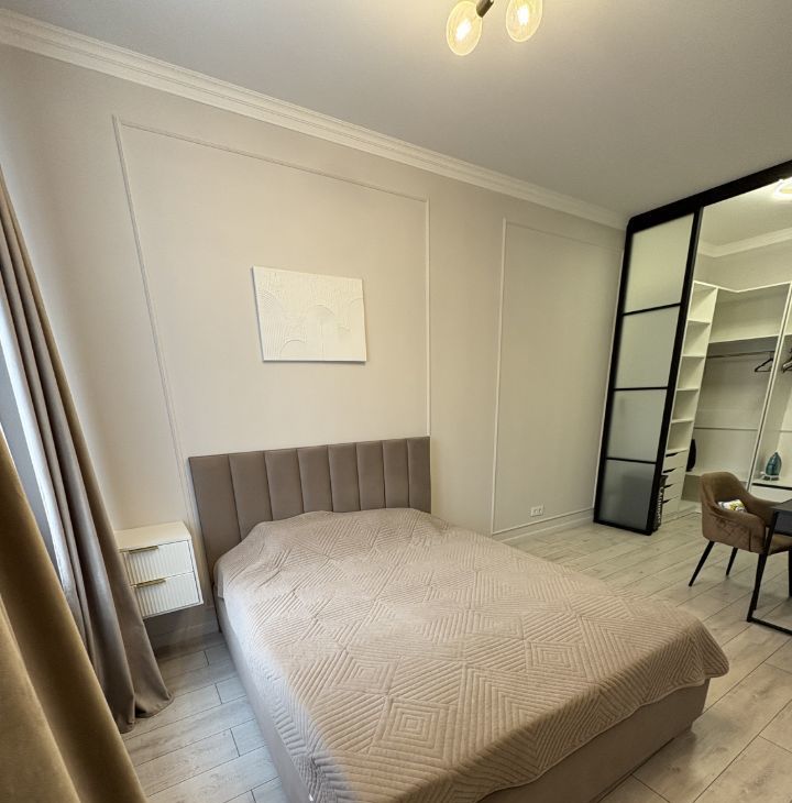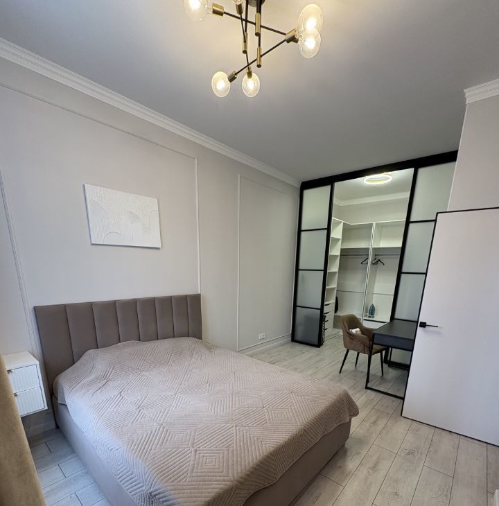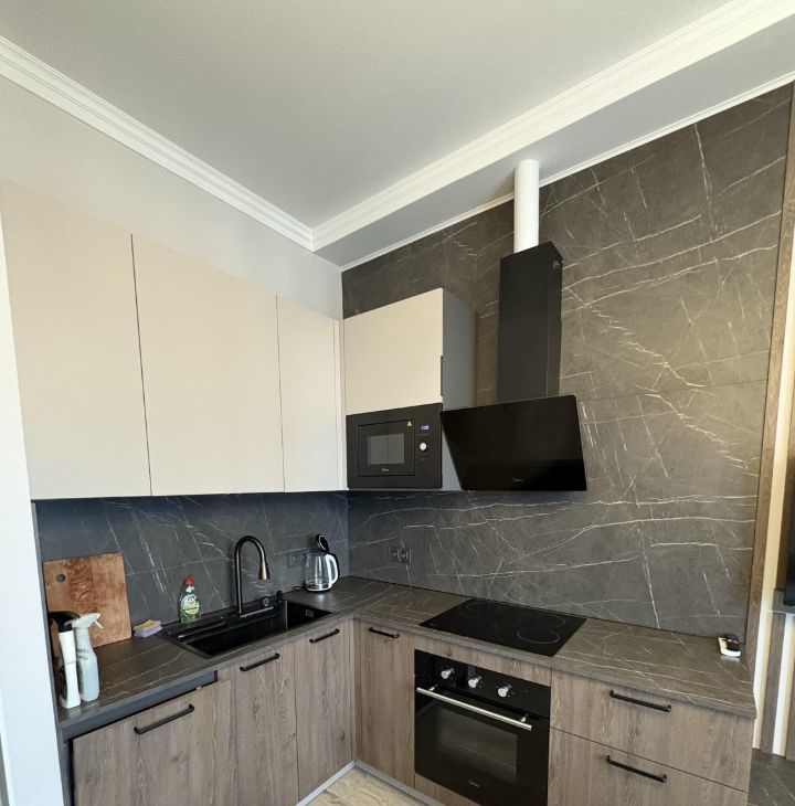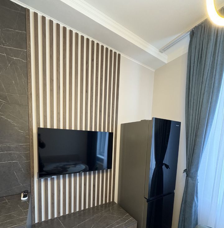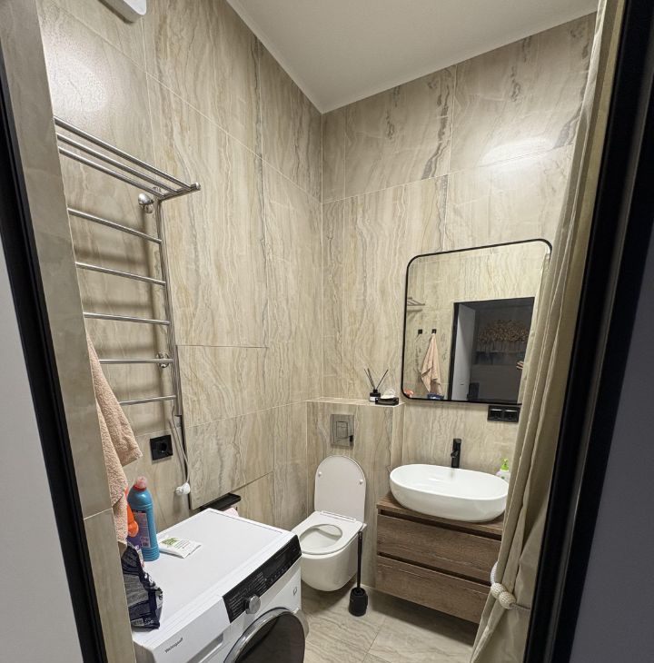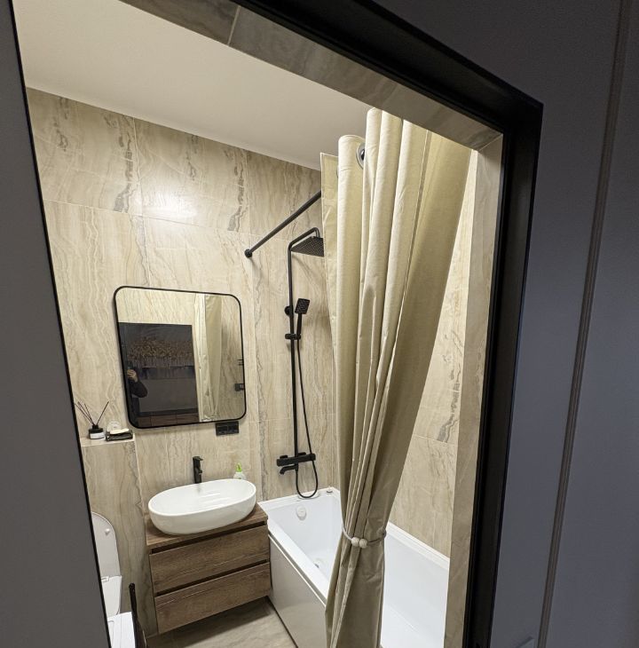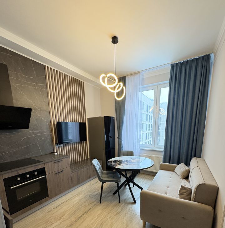 Квартира радует свежим дизайнерским ремонтом и продуманной обстановкой. В комнате и на кухне есть необходимая мебель. Техника включает кондиционер, холодильник, посудомоечную и стиральную машины, а также телевизор. Санузел совмещённый, оборудован ванной. Подключён интернет, поэтому можно легко оставаться на связи.