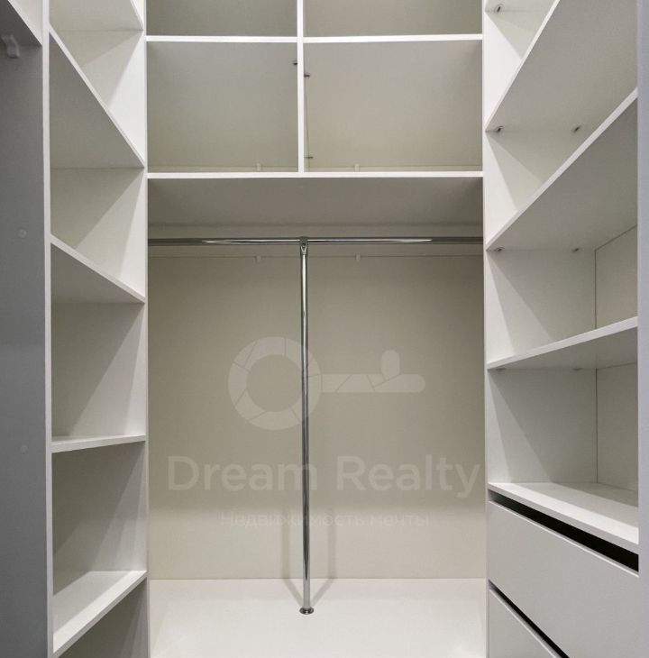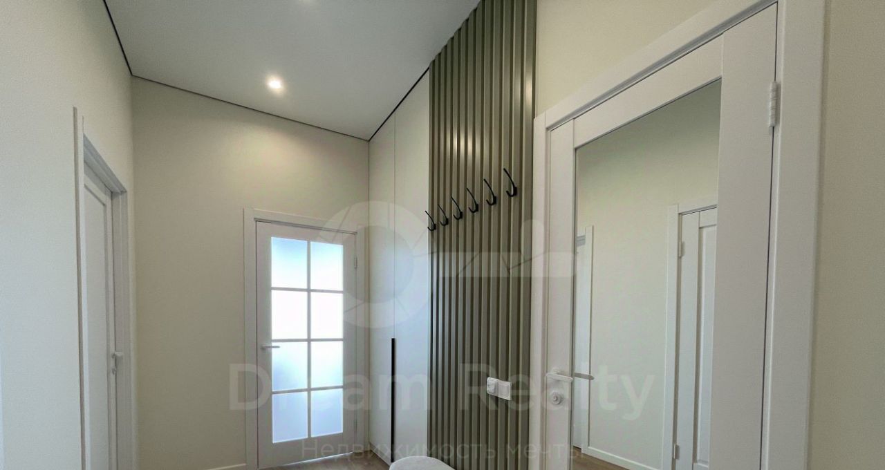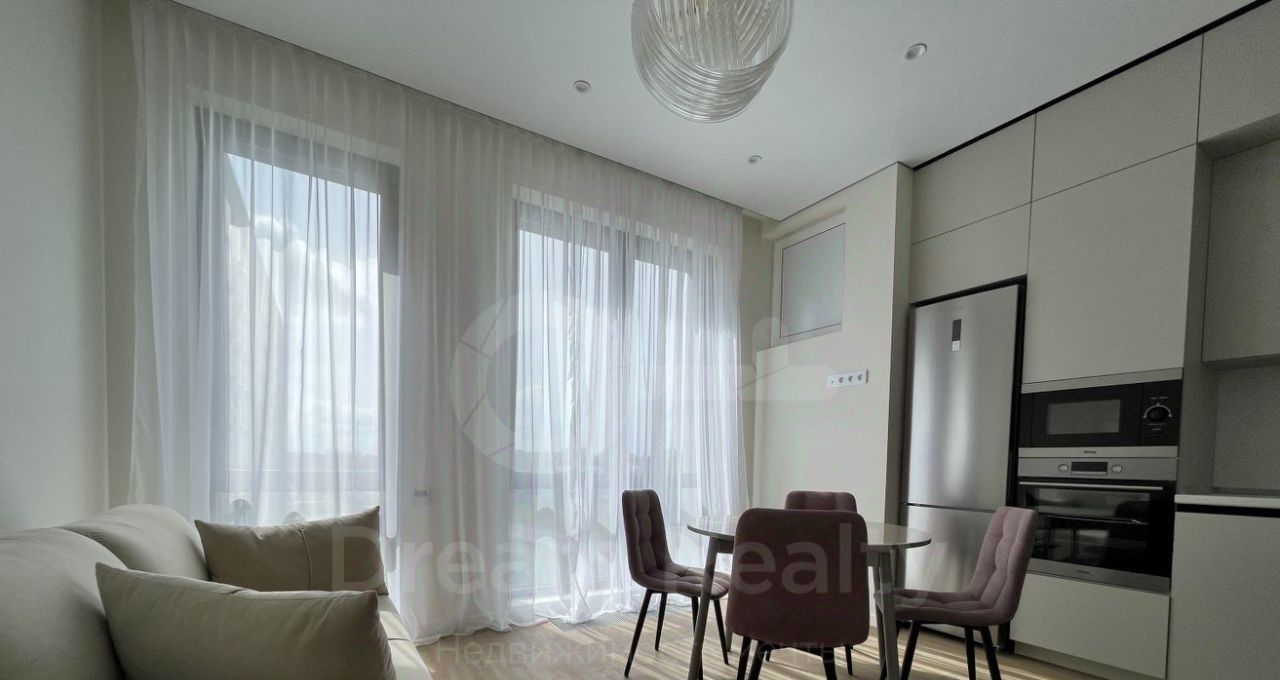 Планировка квартиры: кухня-гостиная с панорамными окнами в пол, спальня, две гардеробные, санузел с ванной, просторный холл. Квартира полностью готова для проживания, оснащена мебелью и встроенной бытовой техникой: варочная поверхность, духовка, микроволновая печь, посудомоечная машина, вытяжка, а также холодильник, стиральная машина. Окна выходят на внешнюю сторону дома.