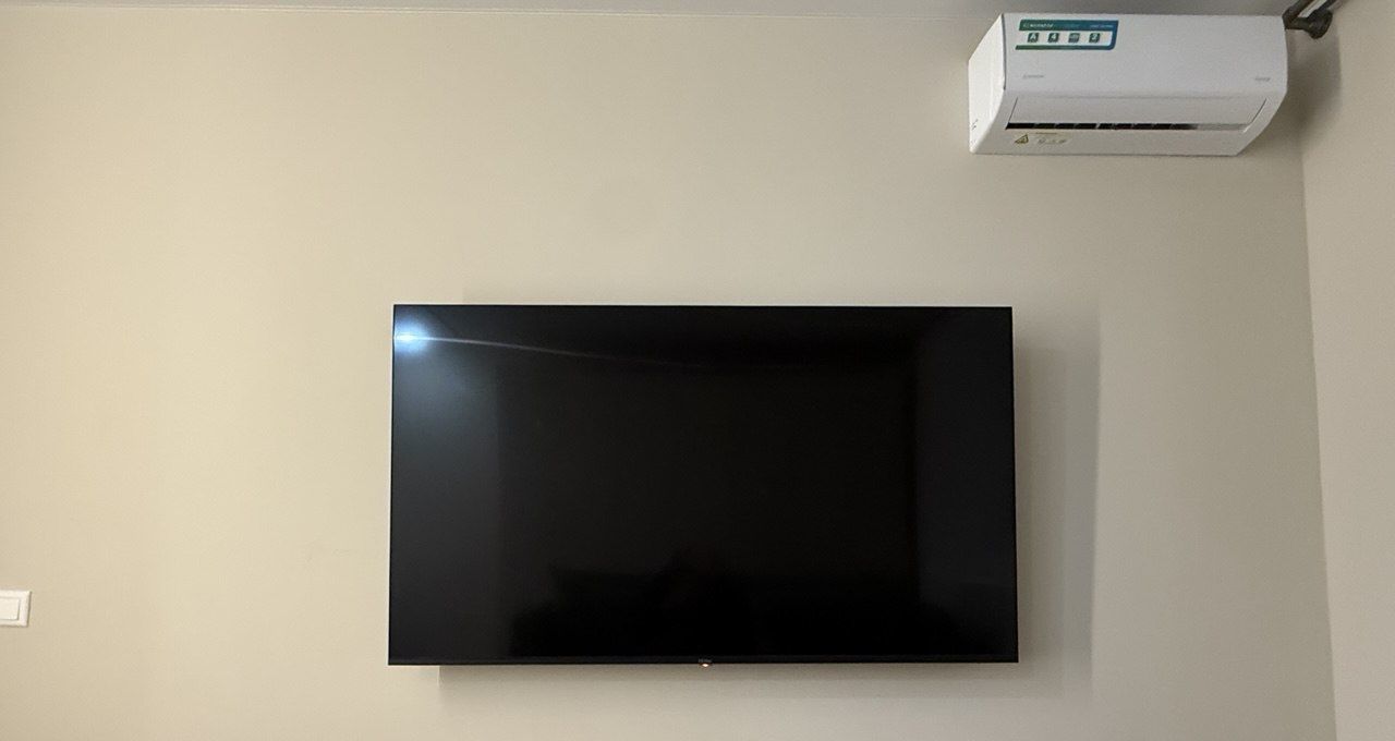 В гостиной перед красивым и удобным диваном располагается телевизор 65 диагонали, что создает атмосферу для релакса.