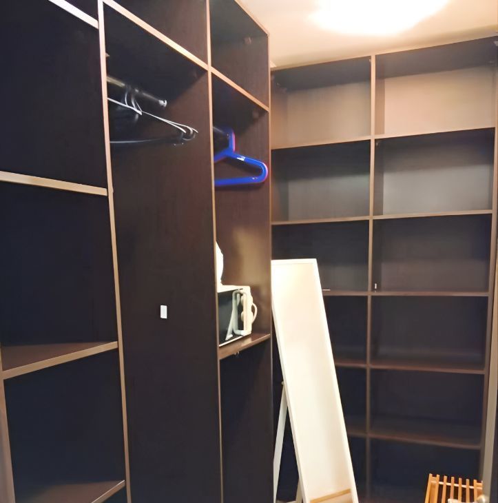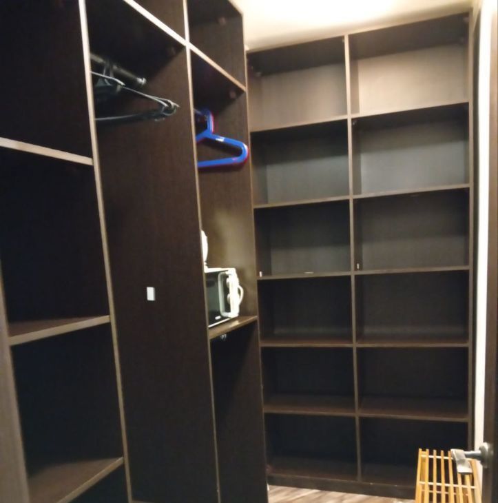 Отдельная вместительная гардеробная, оборудована встроенными шкафами.