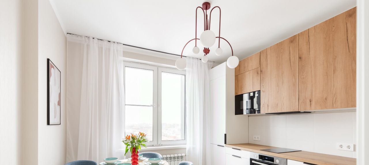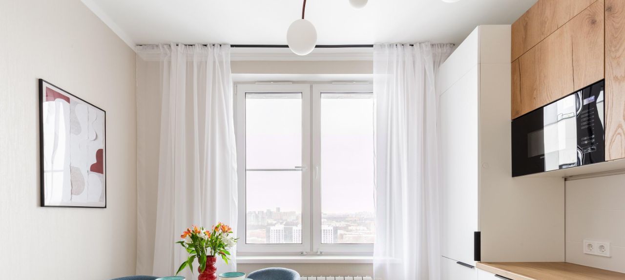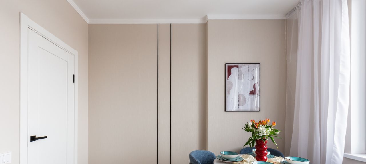 Квартира выполнена с использованием качественных материалов, с преобладанием бежевых, бирюзовых, и светлых тонов и элементами дерева.
