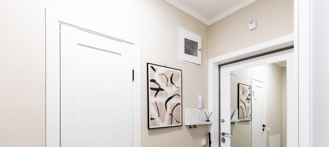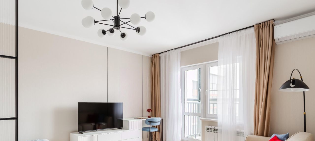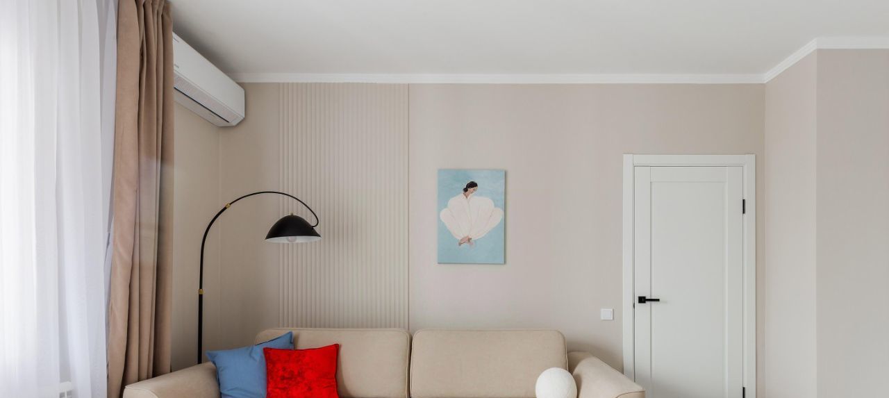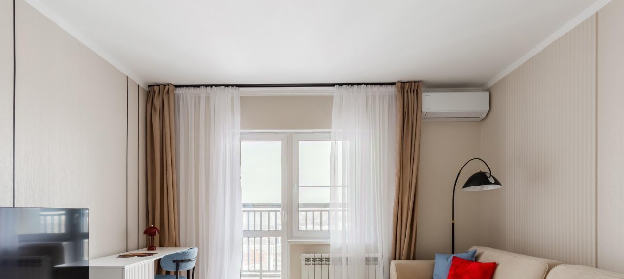 кондиционер в гостиной зоне, удобный матрас Askona на кровати с местом хранения.