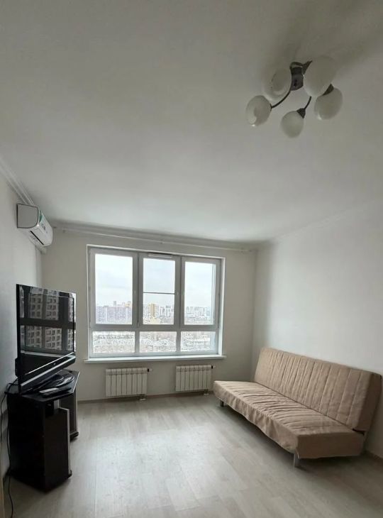 Жилая комната 22,9 м² легко зонируется на гостиную и спальную часть; установлена сплит-система (кондиционер), есть ТВ.