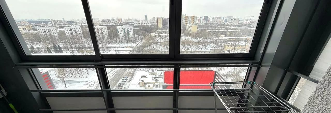 Большая застеклённая лоджия с панорамным остеклением и красивым видом на город — можно использовать как зону отдыха или мини-кабинет.