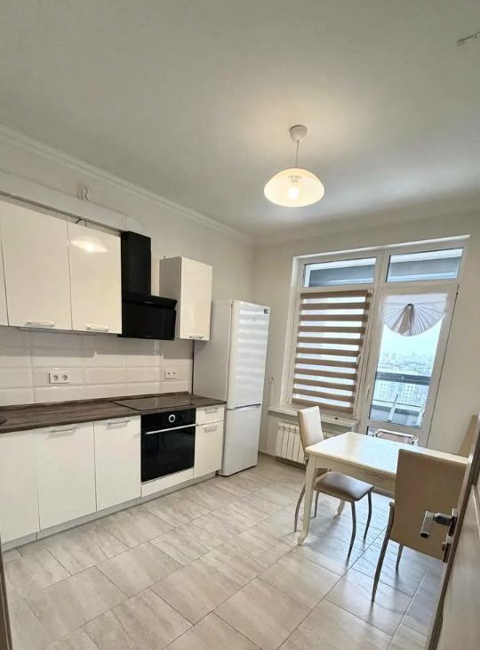 Просторная кухня правильной формы: новый кухонный гарнитур, варочная панель, духовой шкаф, холодильник, обеденная зона — удобно готовить и собираться семьёй.