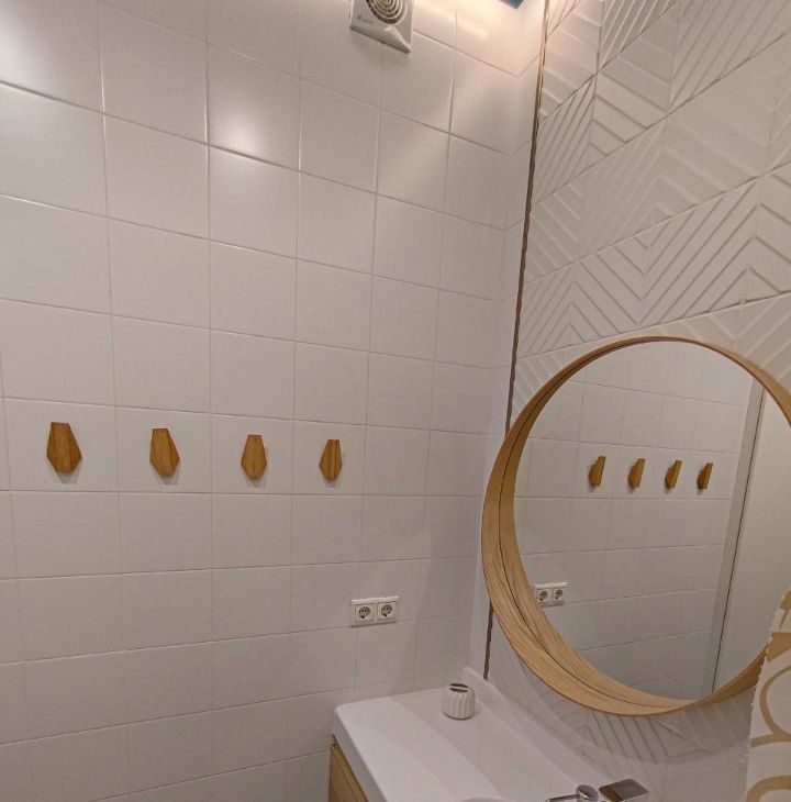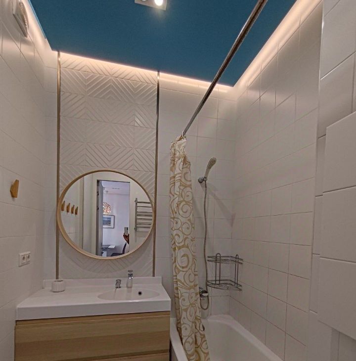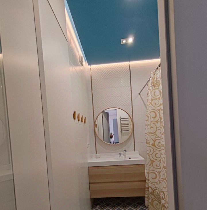Санузел совместный в плитке из керамогранита до потолка. Гигиенический душ.