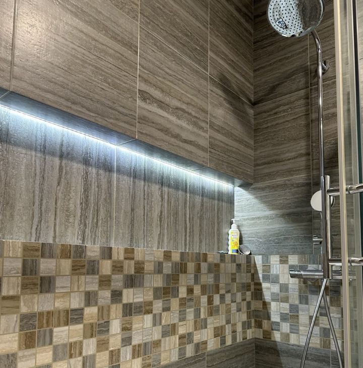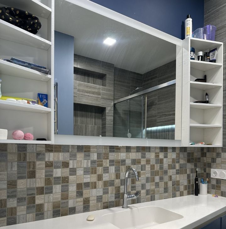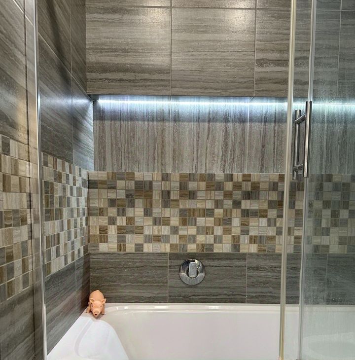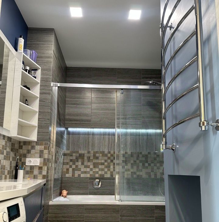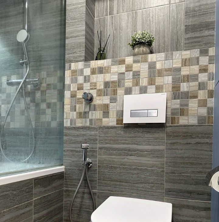 Современный совмещенный санузел с немецкой сантехникой, ванна Jacob Delafon, топовая швейцарская инсталляция Geberit с функцией вытяжки и дезинфекции.