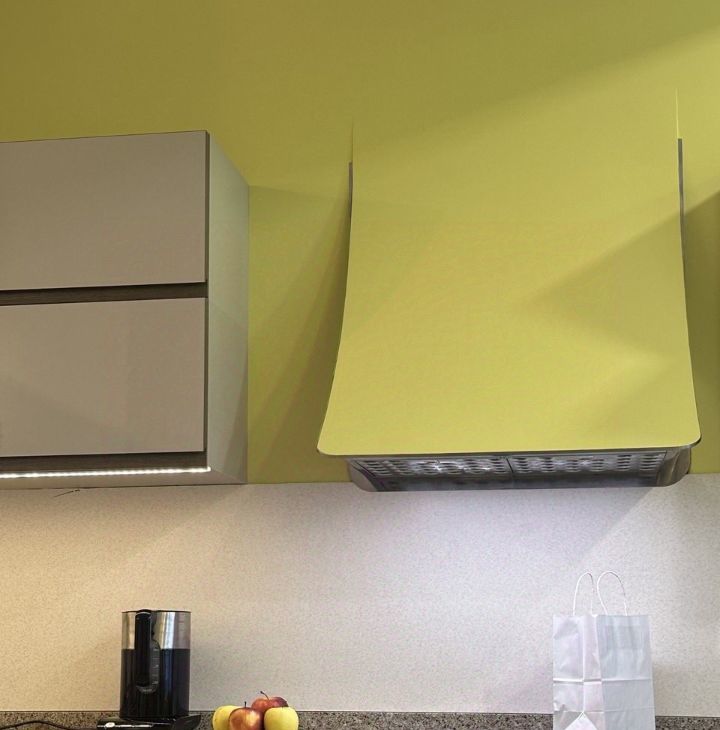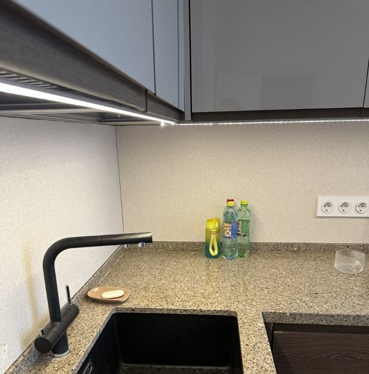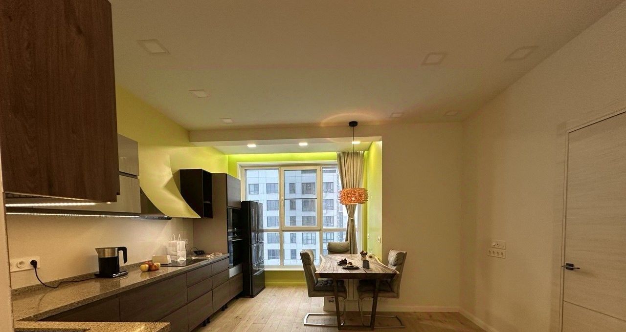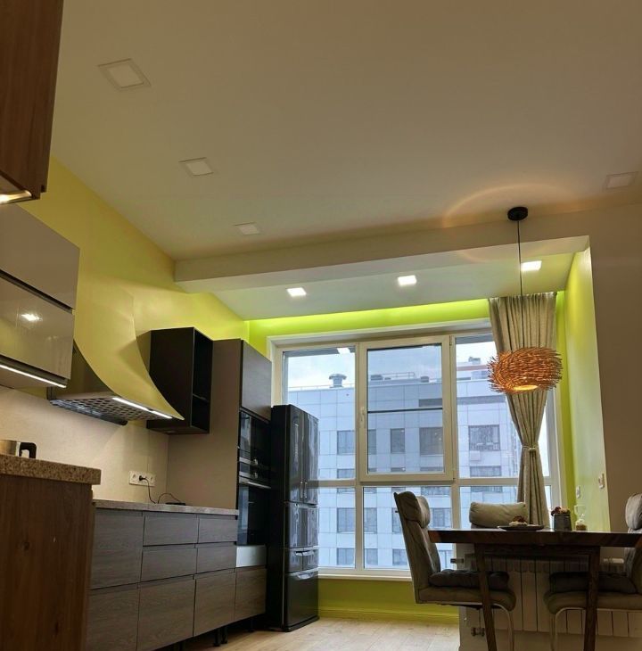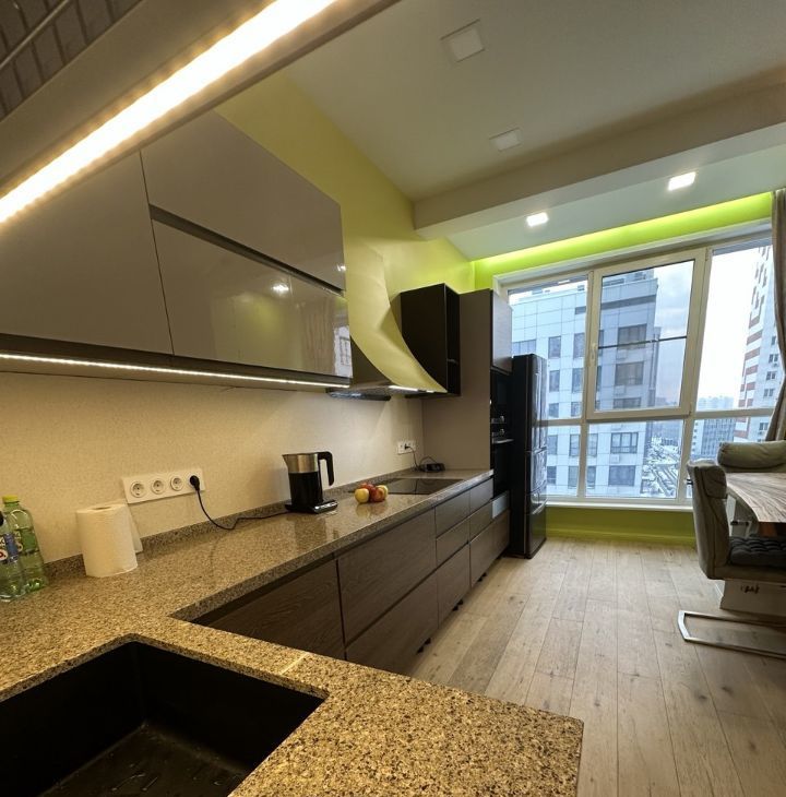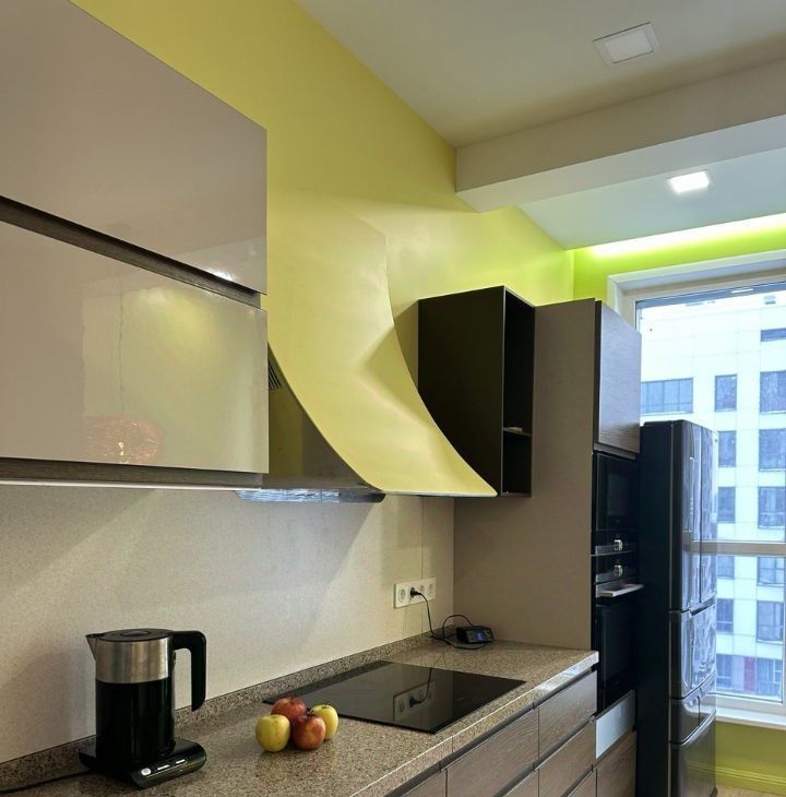 Большая кухня-гостиная, оснащенная итальянской вытяжкой Elica Nuage. Каменная столешница, многоуровневое освещение, полы из инженерной доски Coswik.