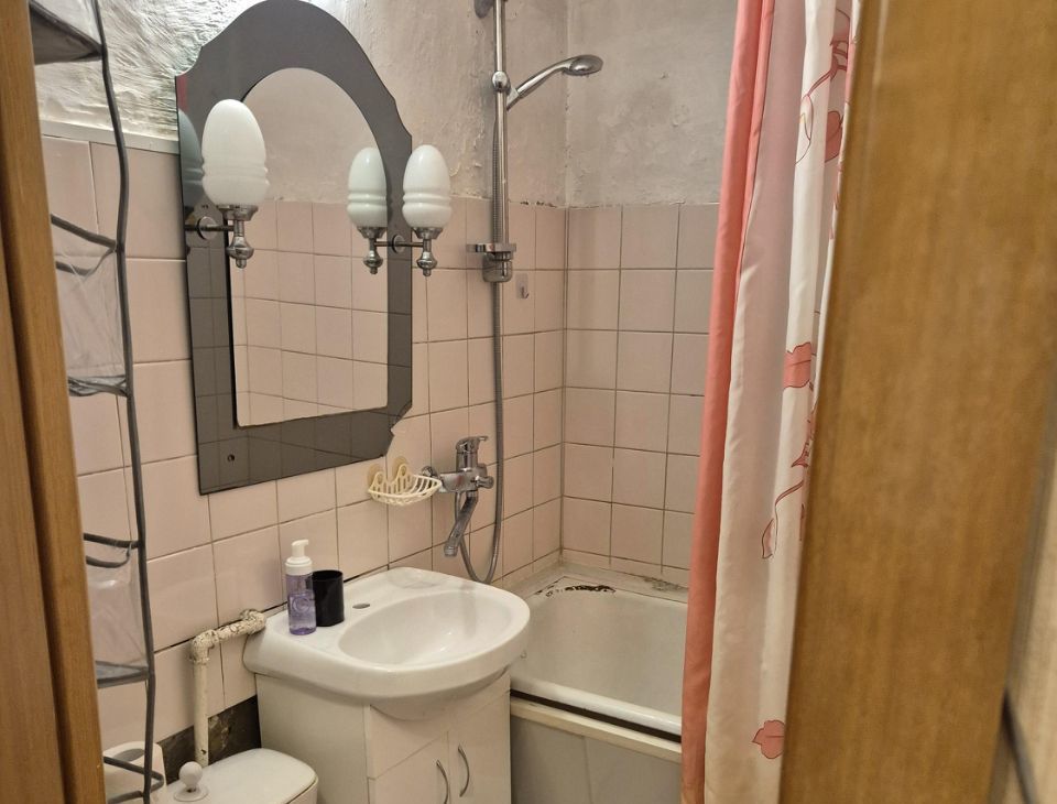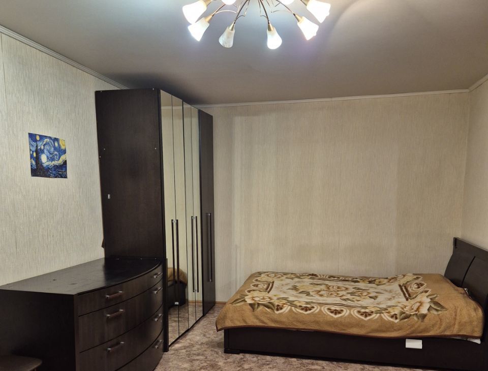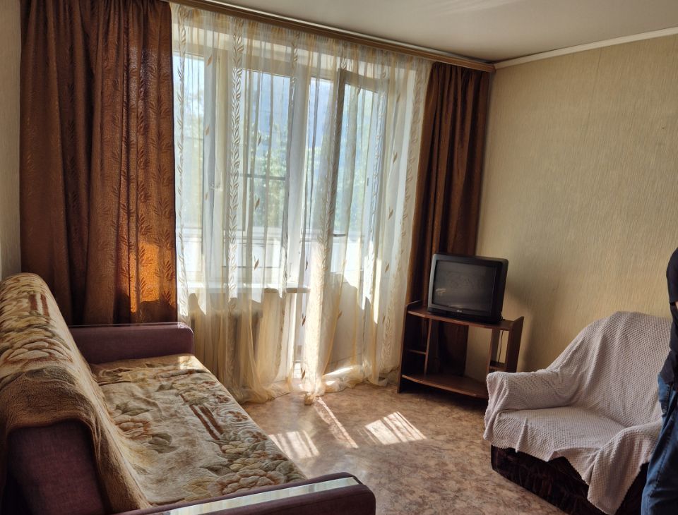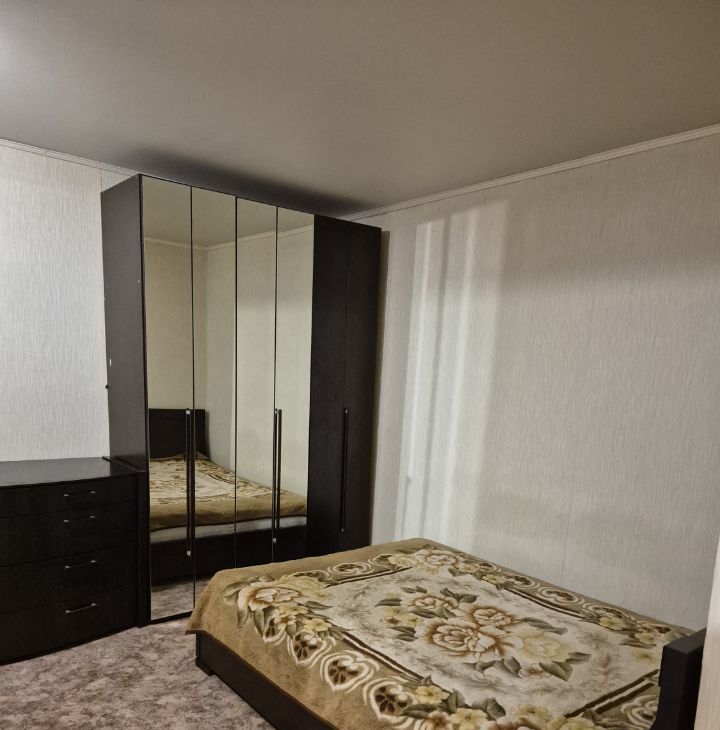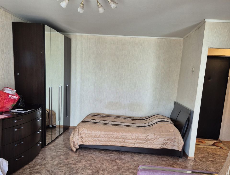 В комнате находится кровать 2-х спальная и диван Из техники: холодильник и стиральная машина. Санузел совмещённый, оборудован ванной. Балкон застеклен