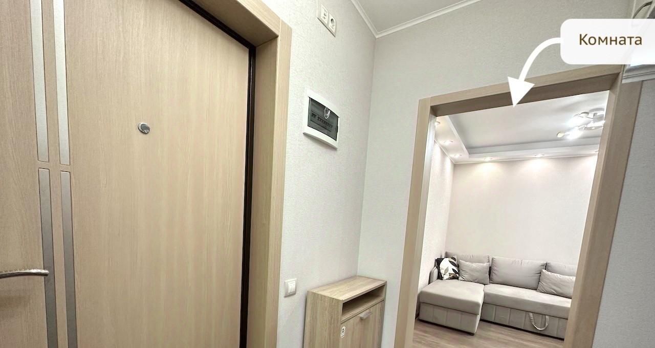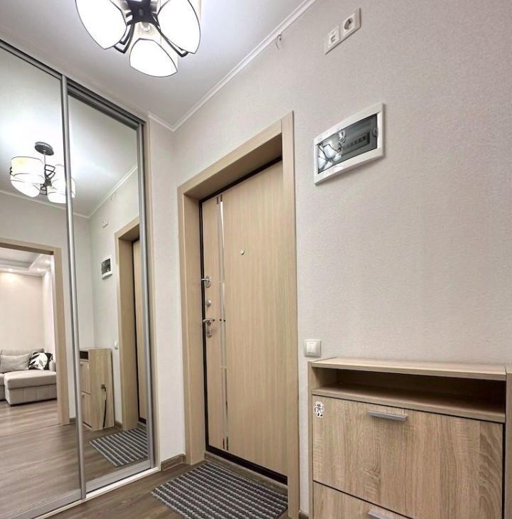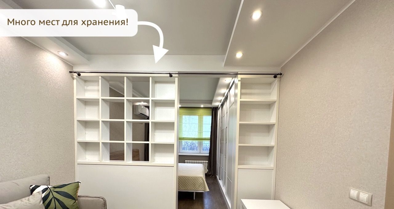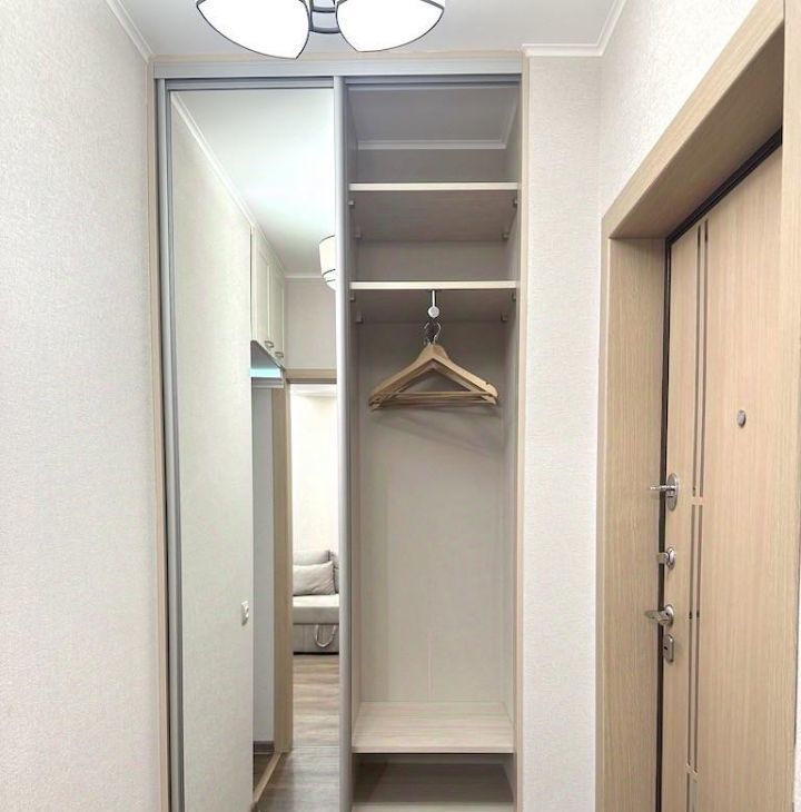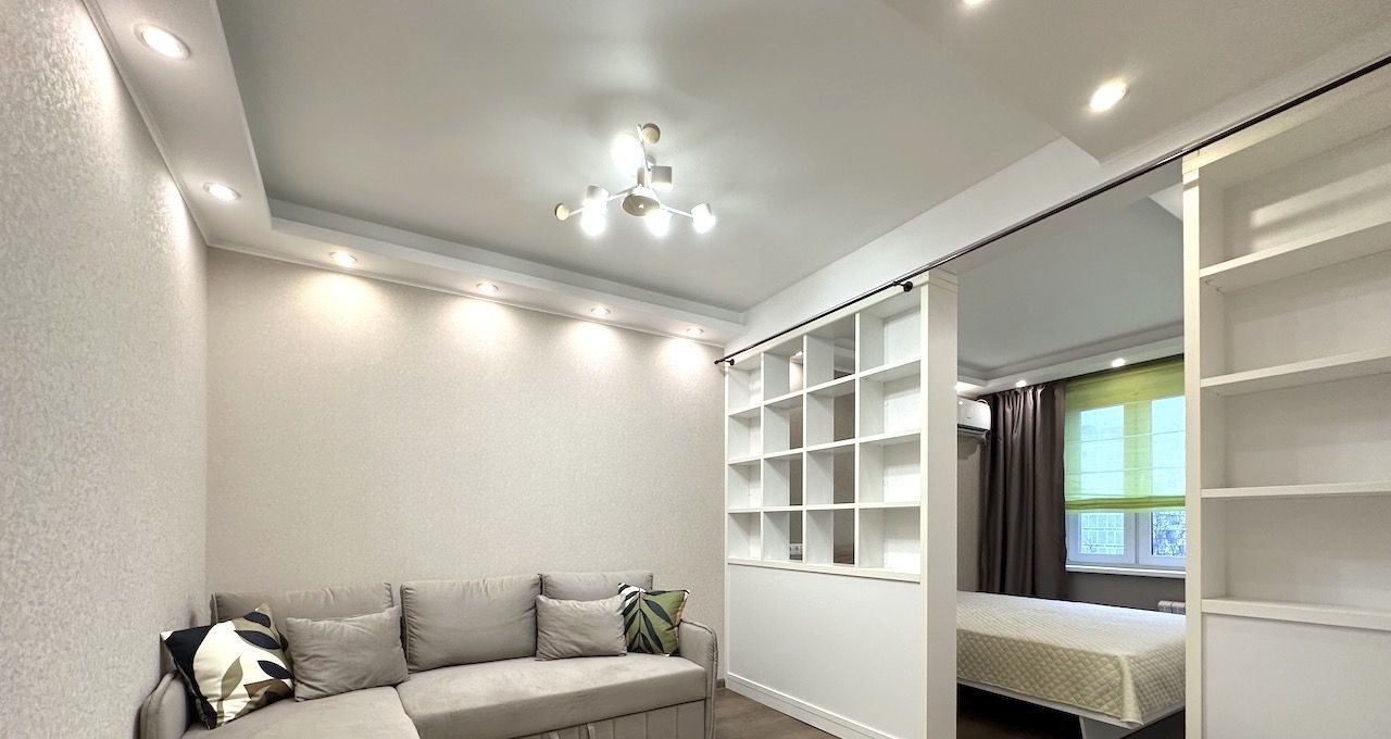 * Квартира чистая и аккуратная, только после ремонта (сдается первый раз)! Все абсолютно новое. Площадь: общая 32.5 м², жилая 18 м², функциональная кухня 6 м². Квартира находится на 8 этаже 9 этажного монолитного дома. Хороший ремонт. В комнате использовано грамотное зонирование: зал, много мест для хранения вещей и зона отдыха.