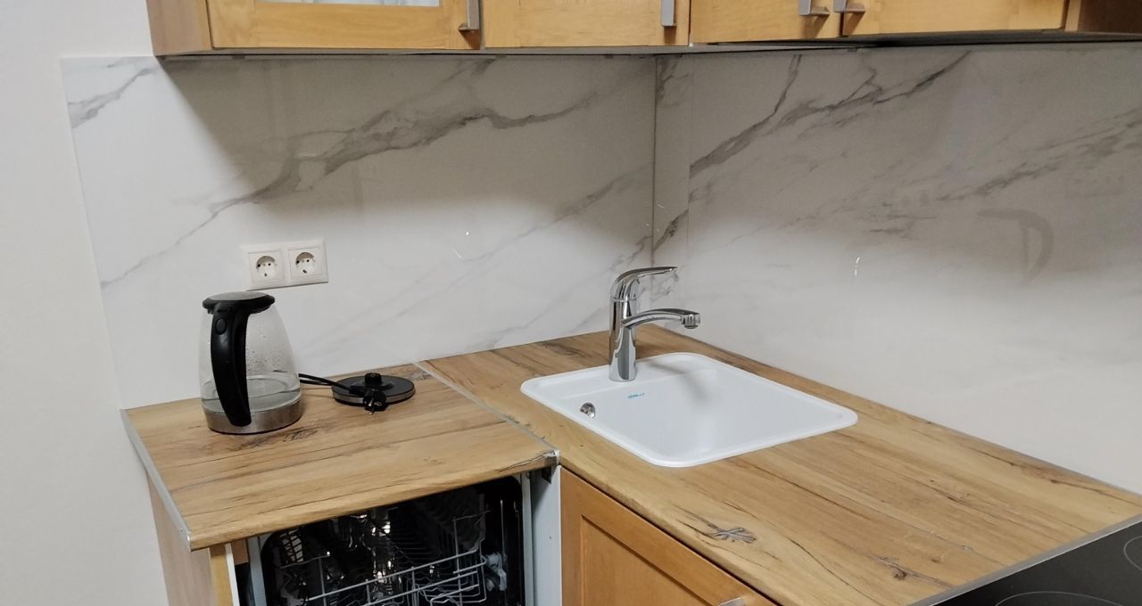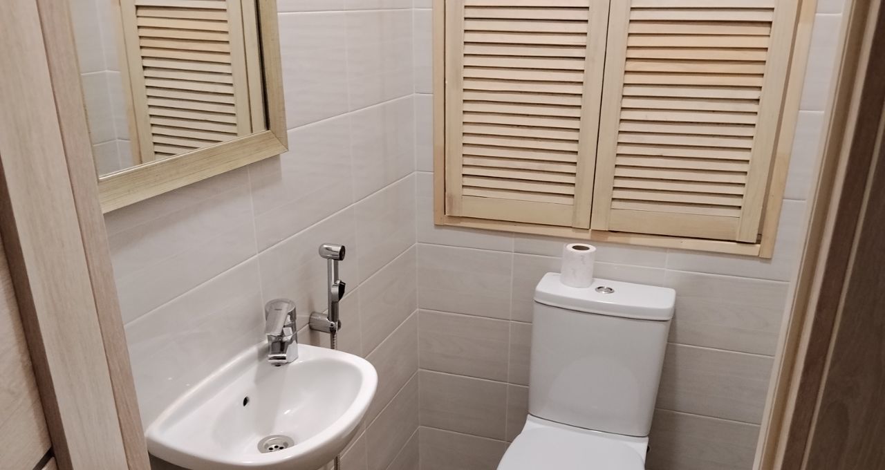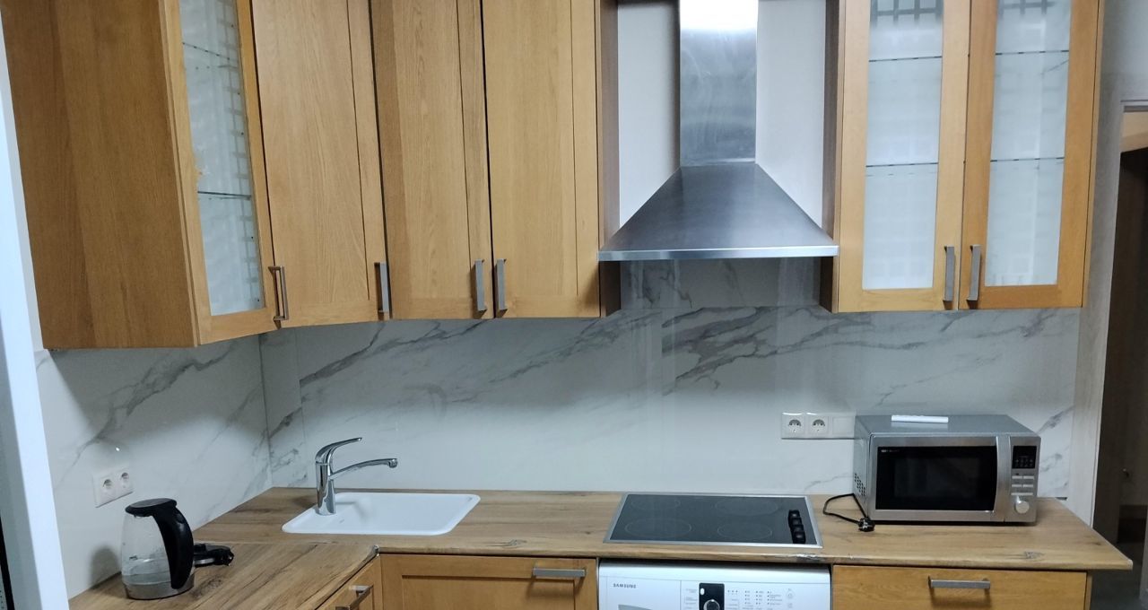 В квартире сделан качественный евроремонт, благодаря чему она выглядит стильно и современно. Здесь есть всё необходимое для комфортного проживания: кондиционер, холодильник, посудомоечная машина, телевизор и стиральная машина. Кухня и комната меблированы, что позволяет сразу заселиться и жить, не задумываясь о дополнительных покупках. В квартире два отдельных санузла и душевая кабина, а также имеется балкон.