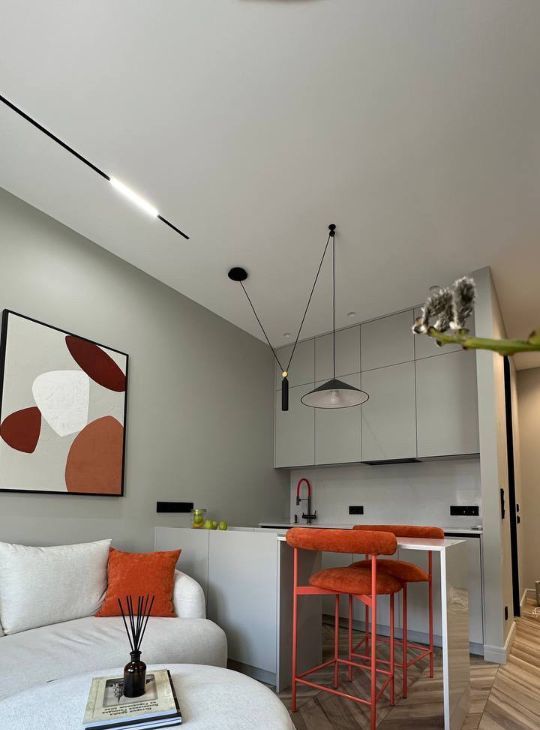 Дизайн сделан в самых модных тенденциях и сочетаниях: на полу -французская ёлочка , двери со скрытой коробкой под цвет стен , мебель самых актуальных форм и цветосочетаний , в санузле керамогранит : мраморный тераццо ; на кухне барная стойка отгораживает зону кухни от зоны гостиной .