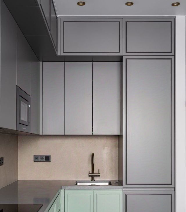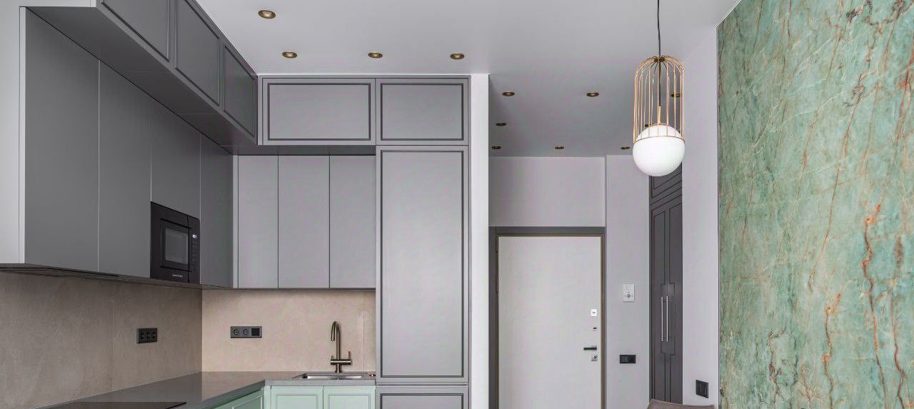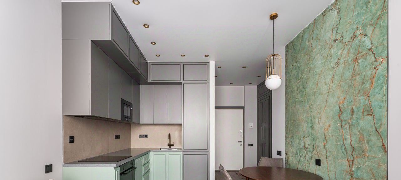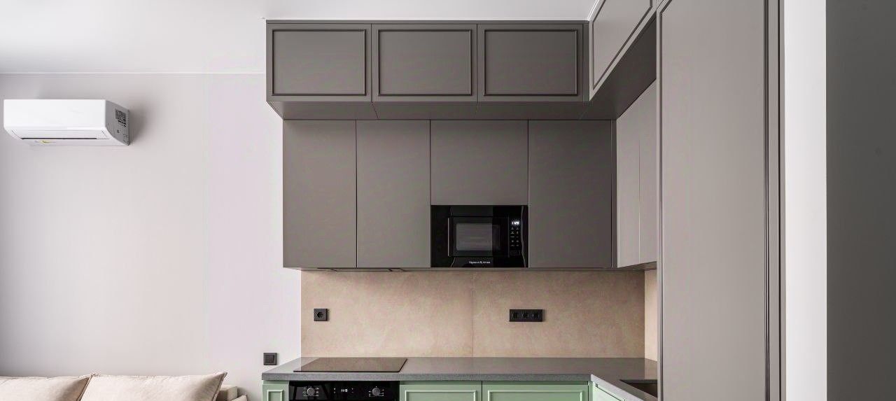 В кухне гостиной встроенный гарнитур, с варочной панелью, духовкой, вытяжкой, холодильником, посудомоечной машиной - Zigmund & Shtain).