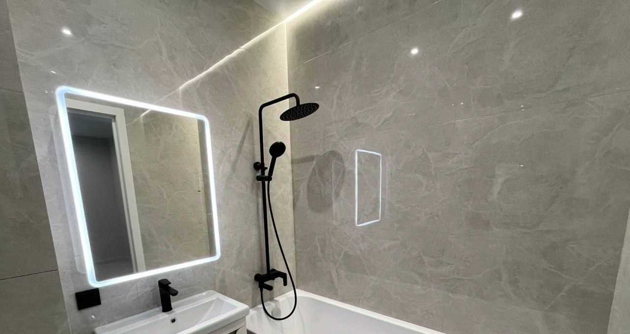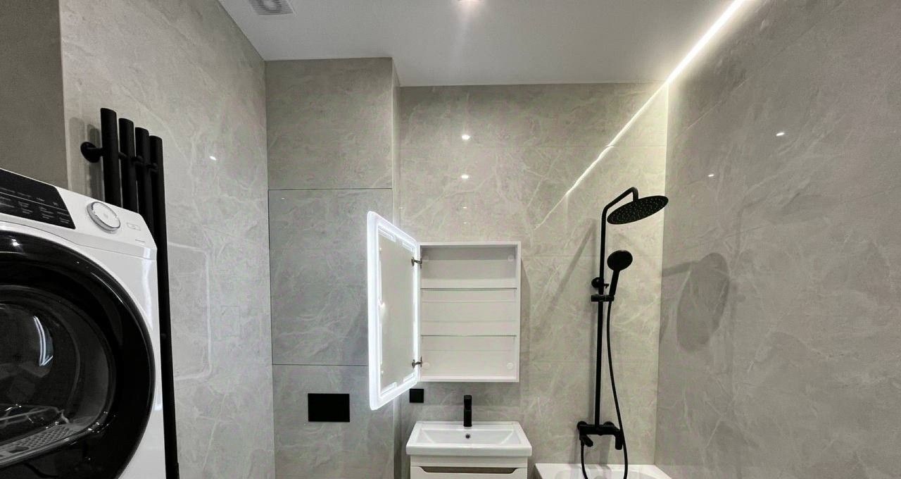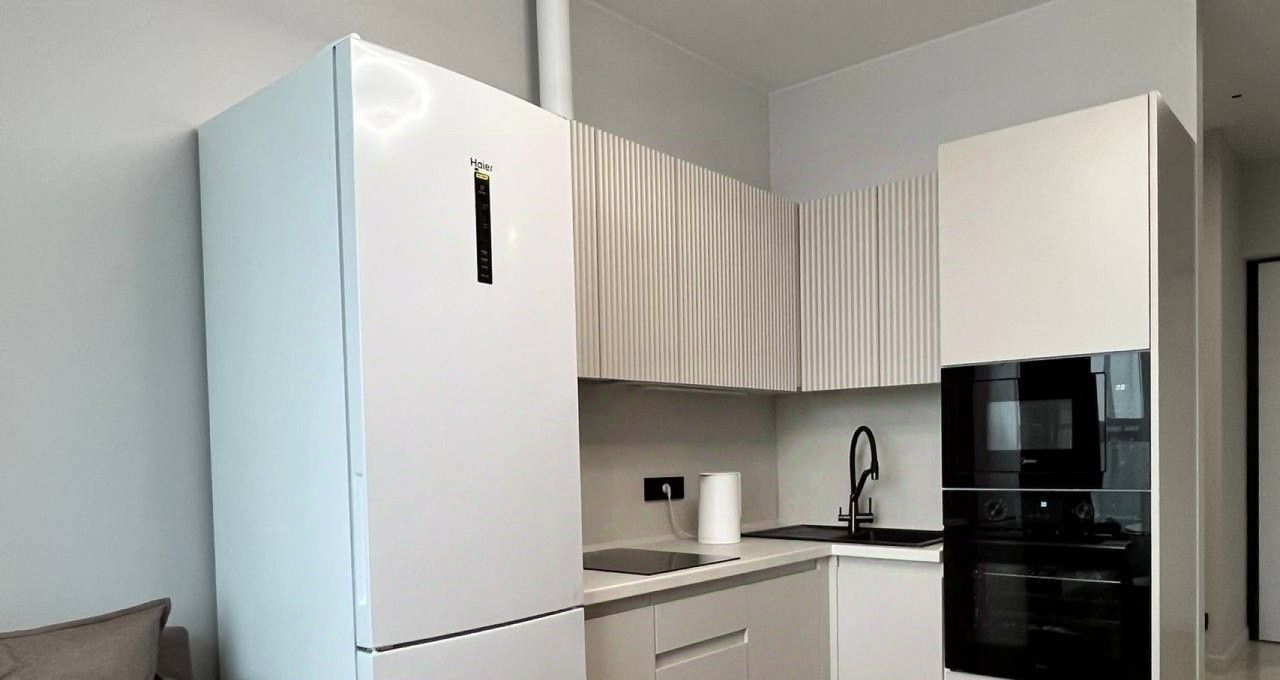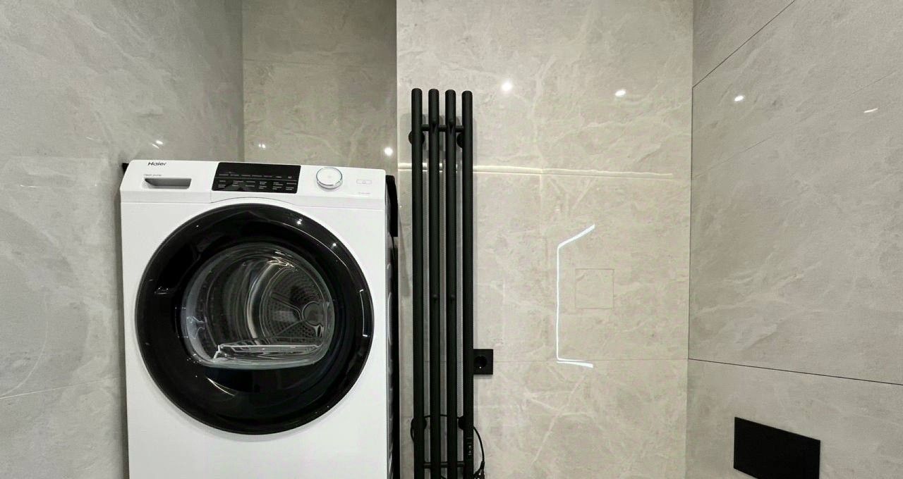 Внутреннее оснащение продумано до мелочей для комфортной жизни. Кухня площадью 8 квадратных метров оборудована полным набором техники: холодильник, варочная панель, вытяжка, кондиционер и посудомоечная машина, а в ванной комнате предусмотрены стиральная и сушильная машины. В комнате также установлен телевизор. Наличие ванны, а не душевой кабины, — редкое преимущество для квартир такого формата. В стоимость аренды уже включены коммунальные платежи, счетчики оплачиваются отдельно по факту расхода. Интернет проведен, что позволяет работать из дома без дополнительных хлопот.